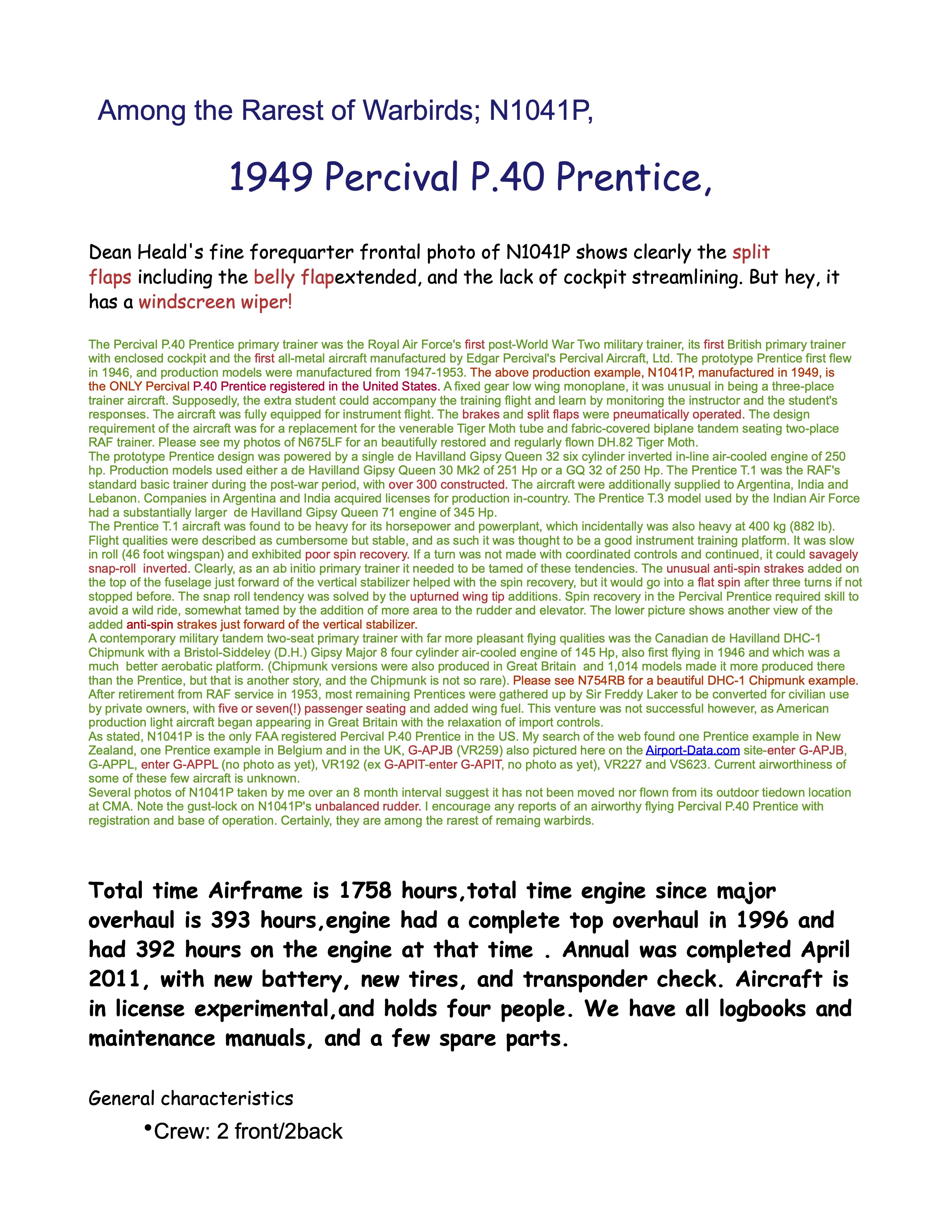 Inspection Status: Can be put back into annual with in a month. You can see a Youtube video of you YouTube Percival Prentice maiden flight. |