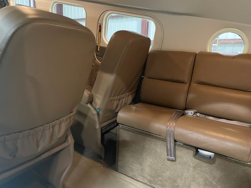 | Custom tan leather executive cabin with tan carpet and new wood accents | |
