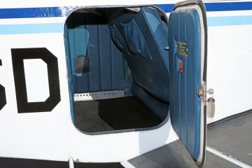 White textured plastic overhead trim and white textured vinyl headliner White metal window trim Blue textured vinyl over blue velour fabric side panels Pilot and copilot blue textured vinyl seats with blue velour fabric inserts, lap belts, and stowable center armrest Aft cabin blue textured vinyl bench seat with blue velour fabric inserts and lap belts Left and right aft cabin emergency windows Overhead cabin speaker Forward cabin upper and lower air vents Aft cabin upper air vents Black floor carpeting Condition 6 (Professional Aircraft Appraisal Organization Interior Grading Guide) |