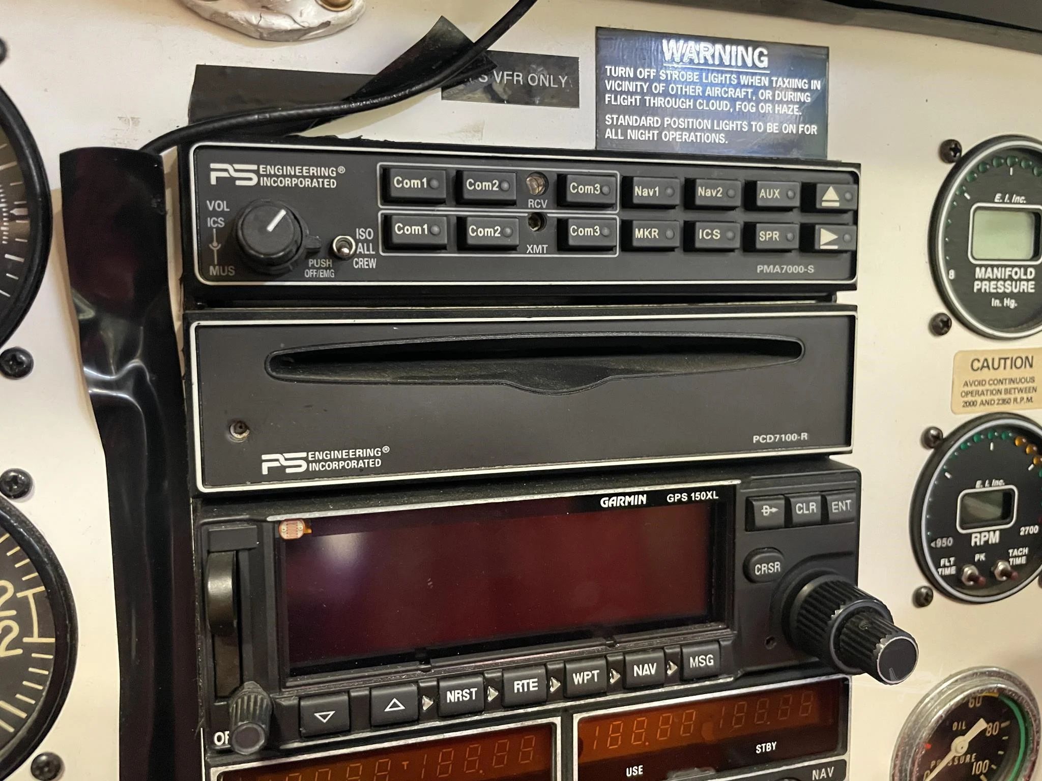 2 Axis Auto pilot Engine Monitor (Insight) King 155 Dual Nav Comms Garmin 150XL Panel Mount GPS Garmin 196 Yoke Mount GPS Storm Scope WX-8 EI Fuel Flow / Pressure EI Digital RPM EI Digital Manifold Pressure CD Player Transponder |
