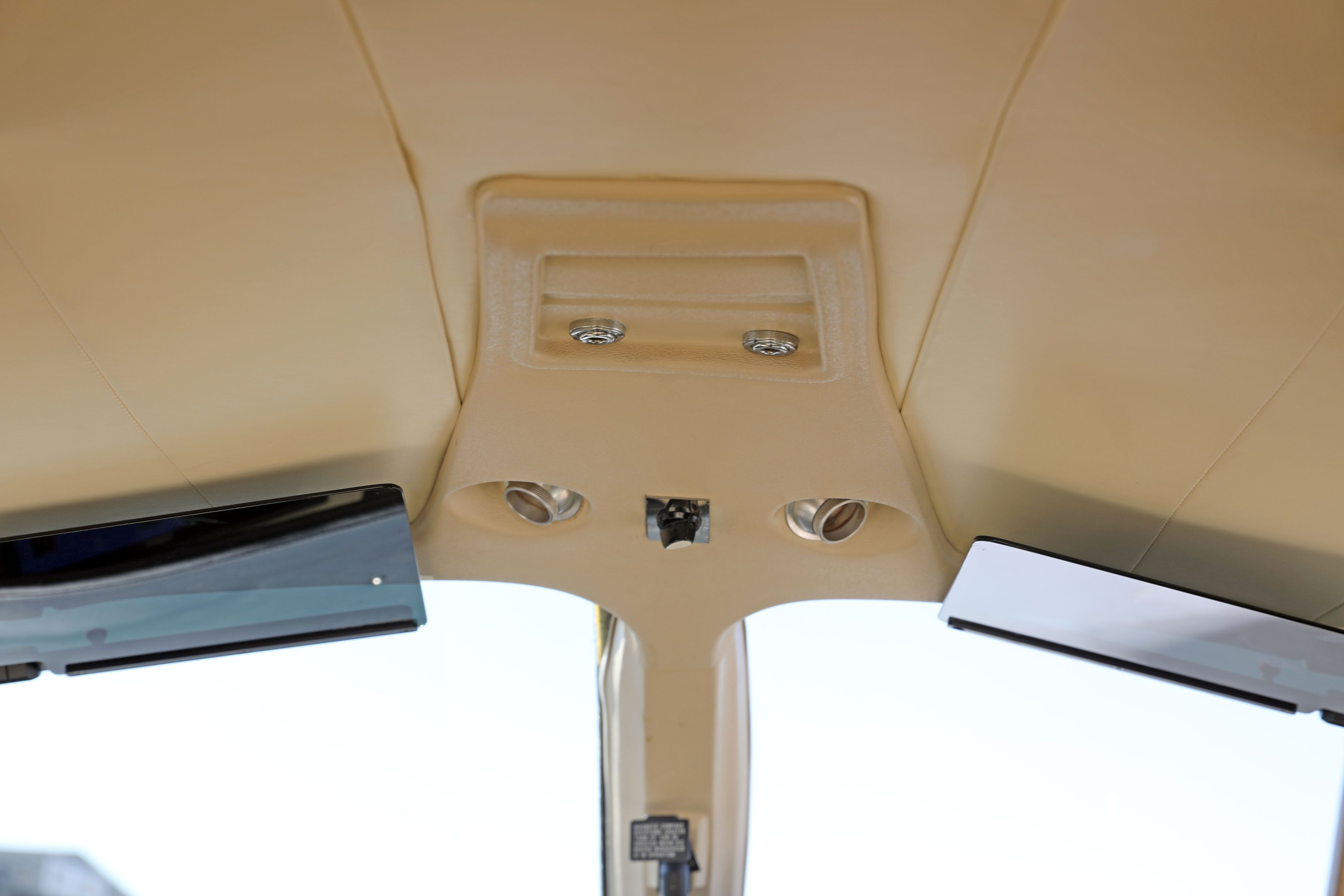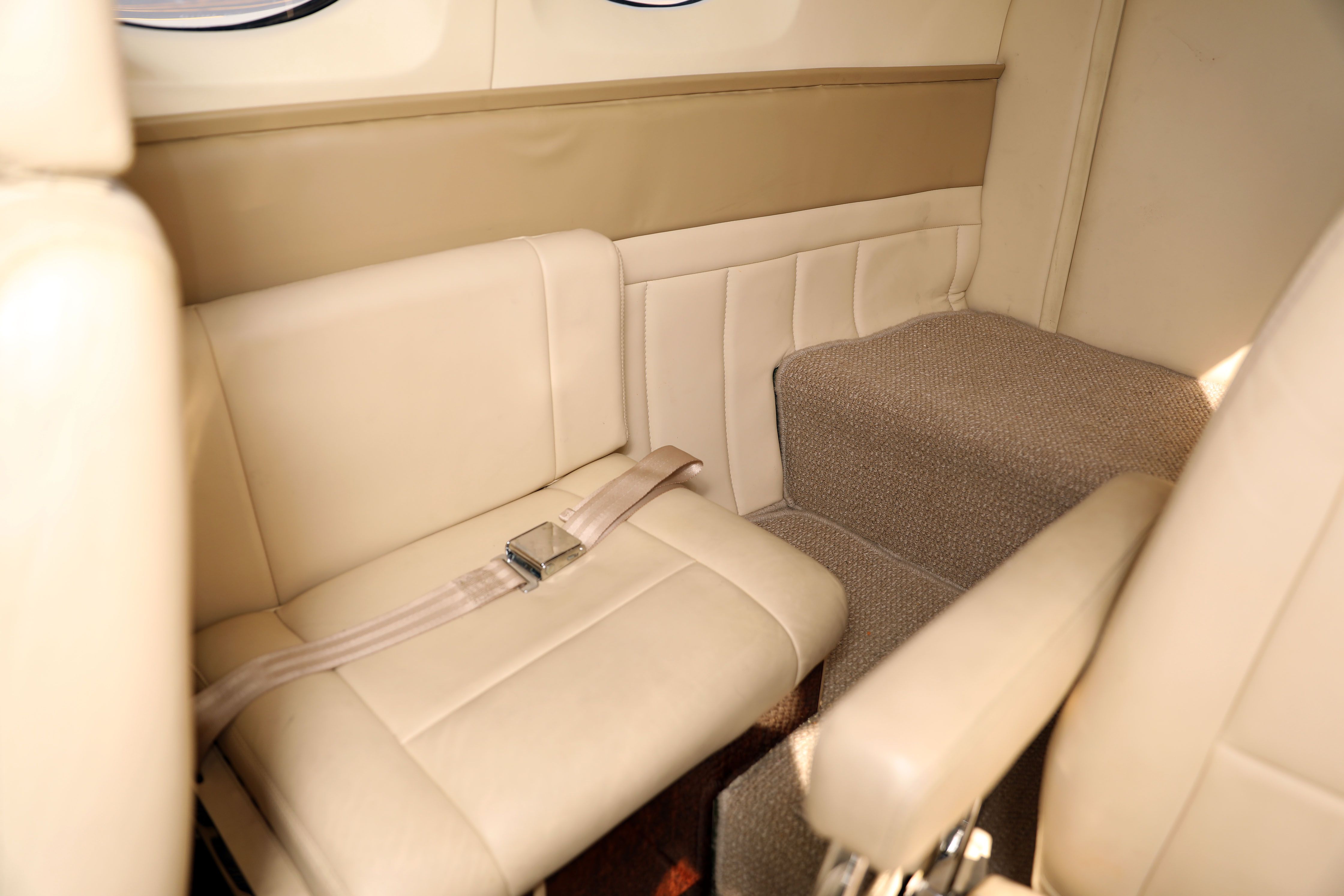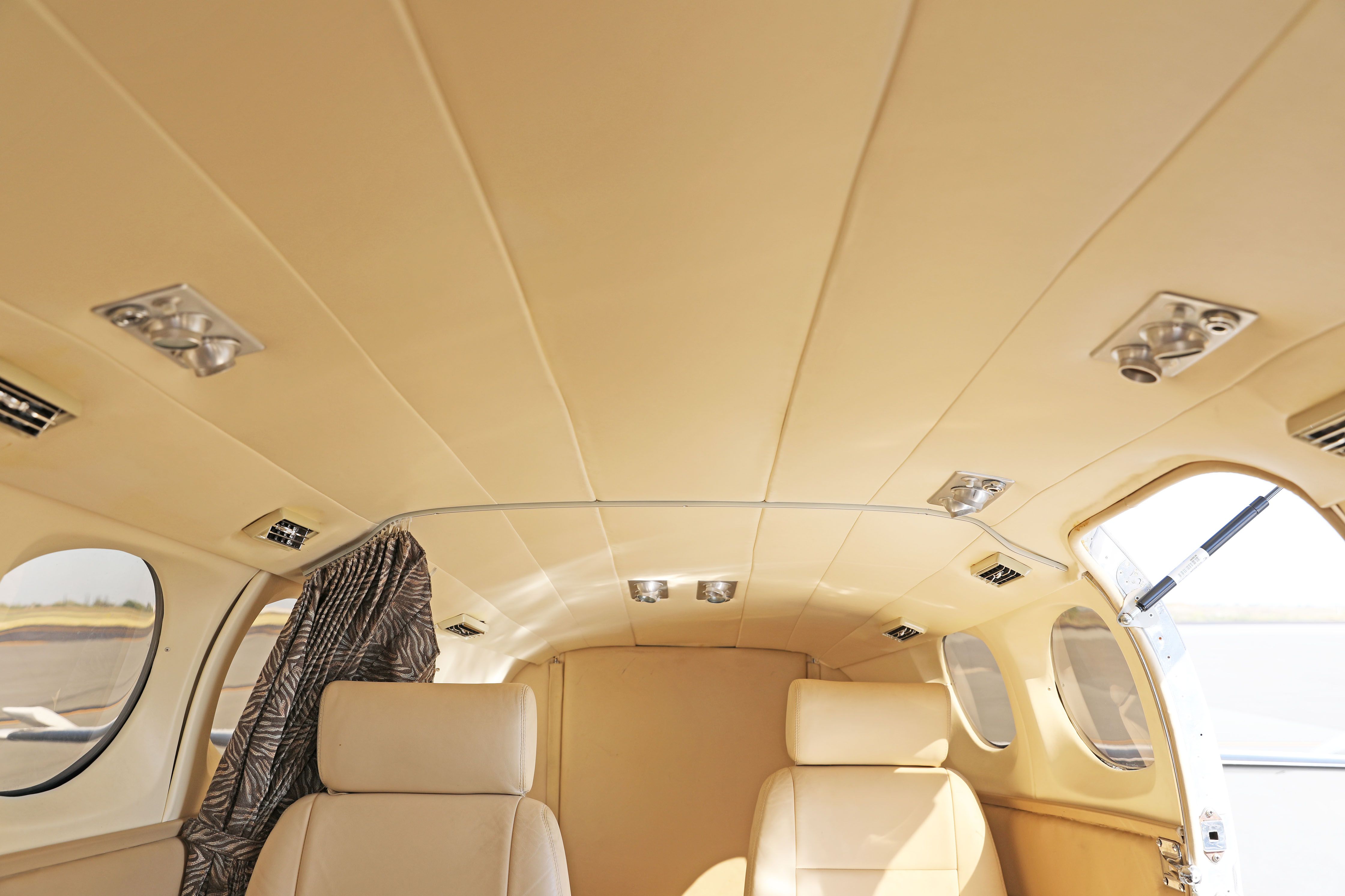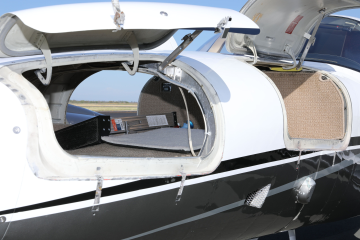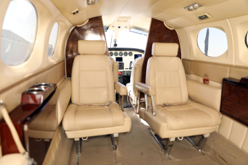 Interior refurbished in 2015 Cabin entryway light Beige leather headliner Beige leather window trim Beige and dark beige leather side panels Fully articulating pilot and copilot beige leather seats with sheepskin inserts, stowable center armrests, shoulder harnesses and lap belts Four place club beige leather seats with headrests, stowable center armrests and lap belts Aft cabin beige leather belted lav seat Right and left side cabin stowable dark wood executive writing tables with dual cup holders Dark beige tweed floor carpeting with tweed carpeting runners Cockpit overhead air conditioning vents Overhead speaker Cabin overhead individual air conditioning vents and spot lights Aft cabin cargo/baggage area Condition 7 (Professional Aircraft Appraisers Organization Interior Grading Guide) |