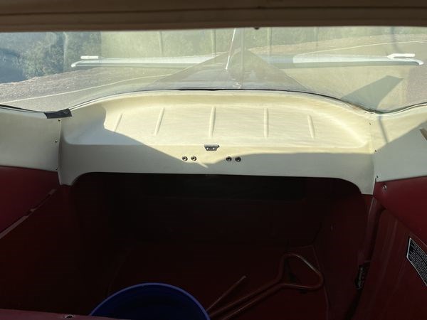 Maroon fabric and vinyl seats with matching side panels. Hard headliner. All in good condition. Overall rated 8 out of 10.