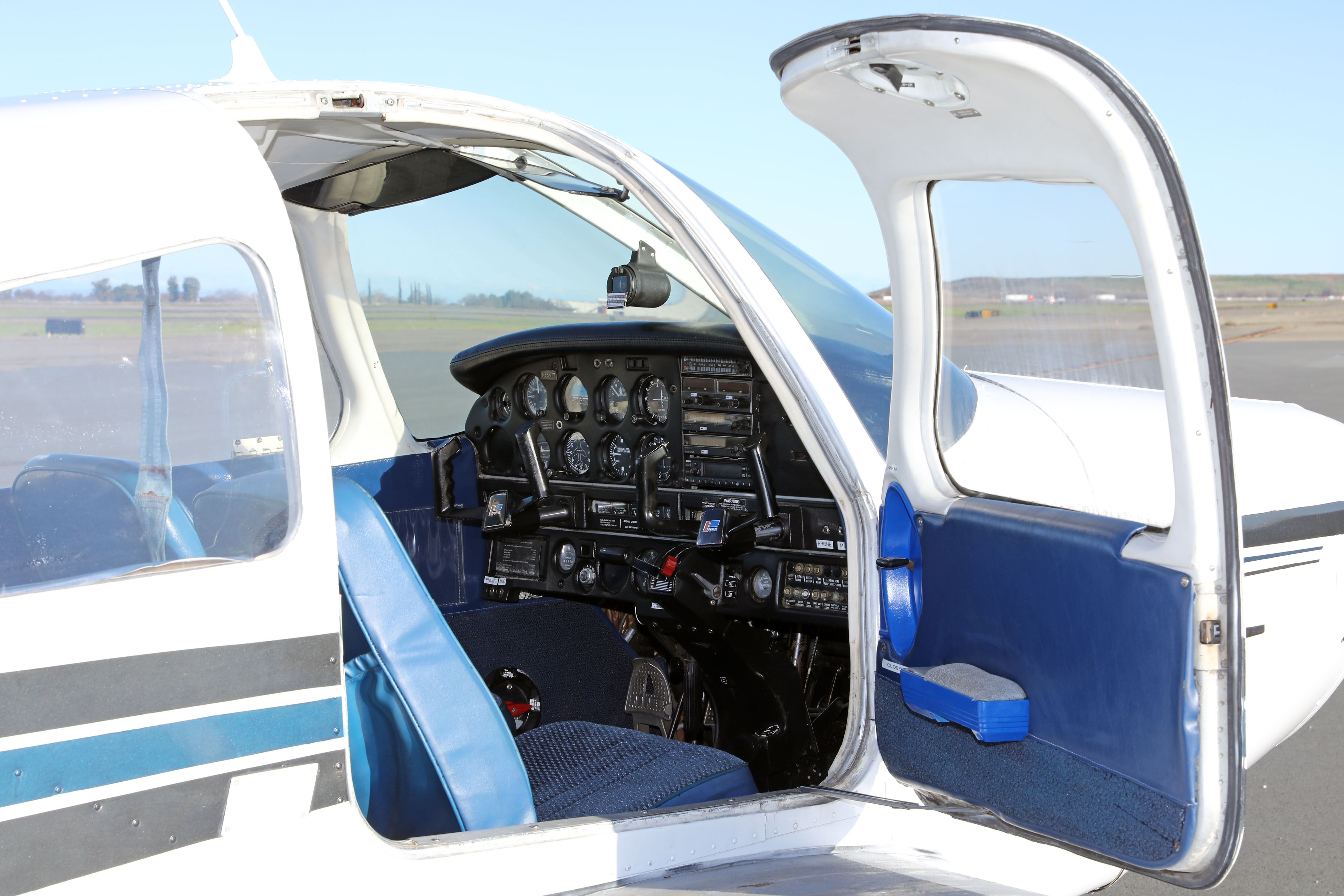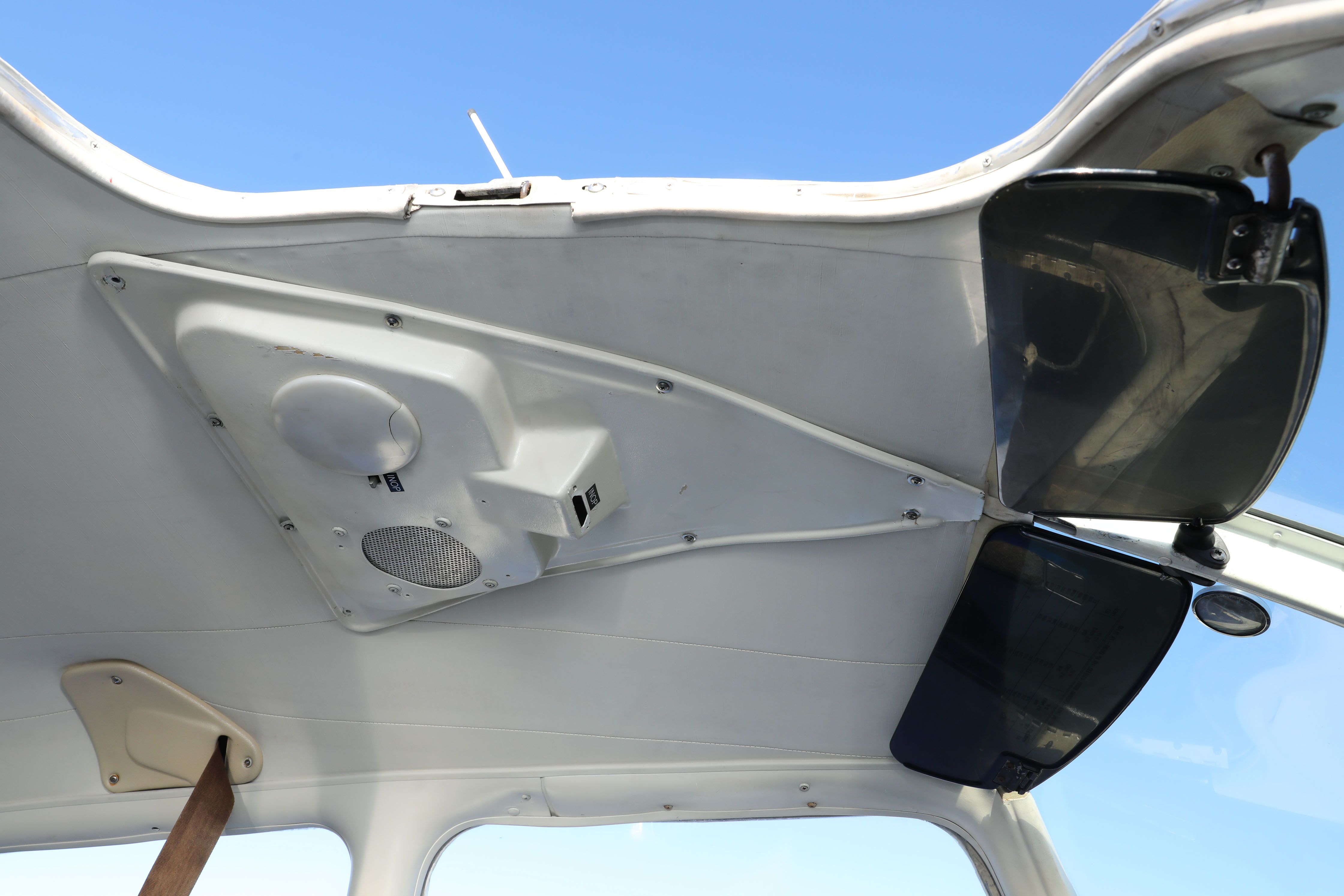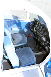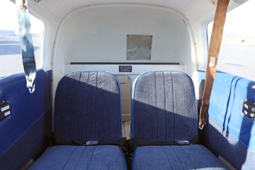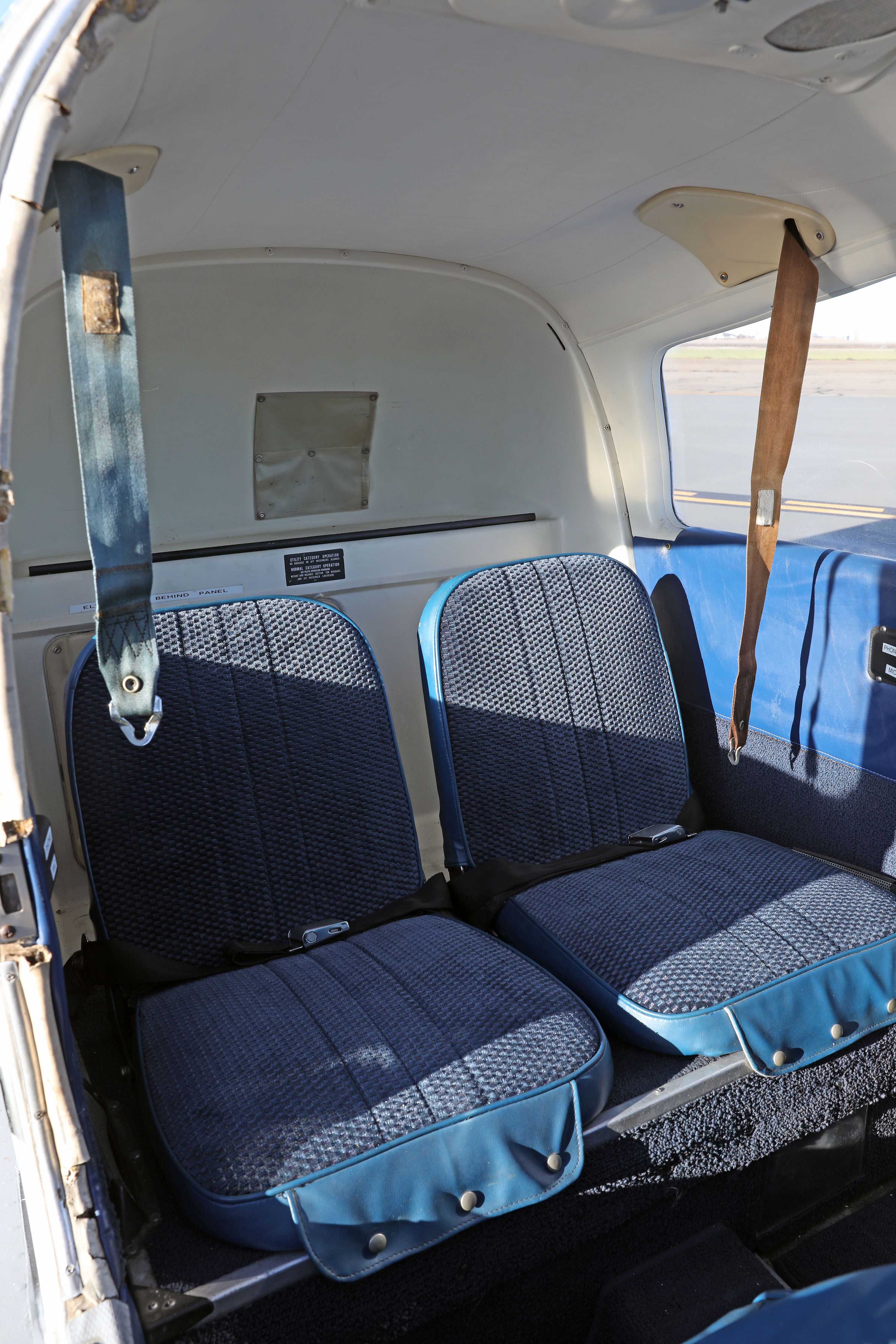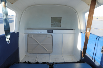 White textured vinyl headliner with white textured plastic overhead console White plastic window trim Blue vinyl over blue carpeting side panels Pilot and copilot blue vinyl seats with blue fabric inserts, shoulder harnesses and lap belts Aft cabin blue vinyl folding seats with blue fabric inserts and lap belts Overhead forward map/instrument light Overhead switchable cabin dome light Overhead cabin speaker Forward cabin lower air vents Aft cabin lower air vents Blue floor carpeting Aft cabin cargo/baggage area with hat shelf Condition 7 (Professional Aircraft Appraisal Organization Interior Grading Guide) |