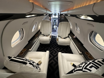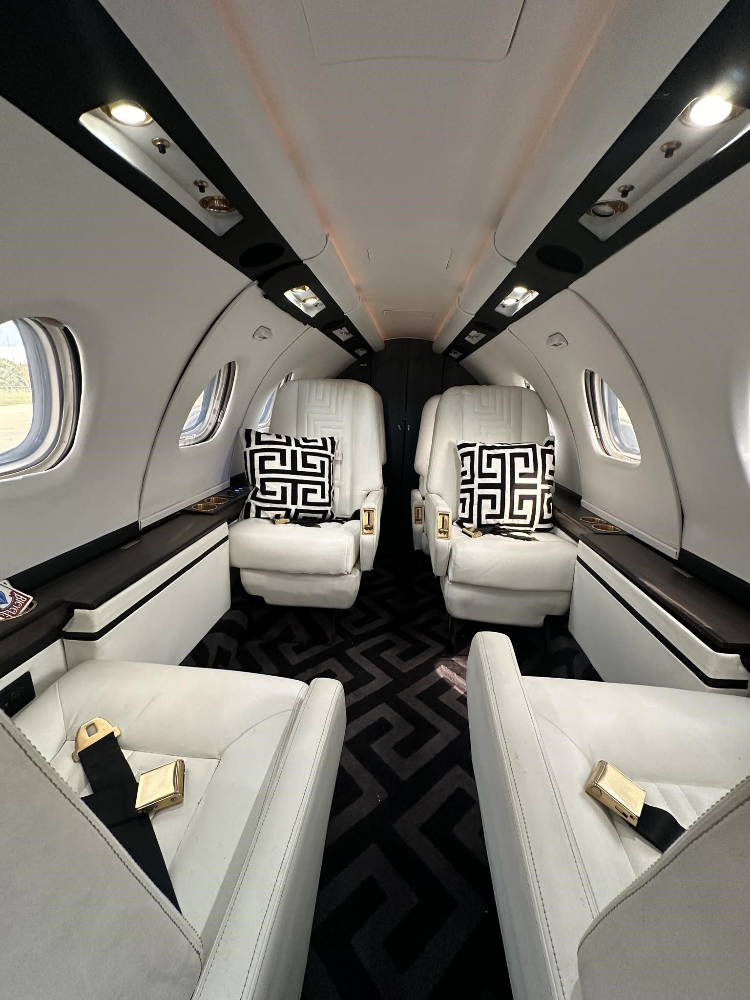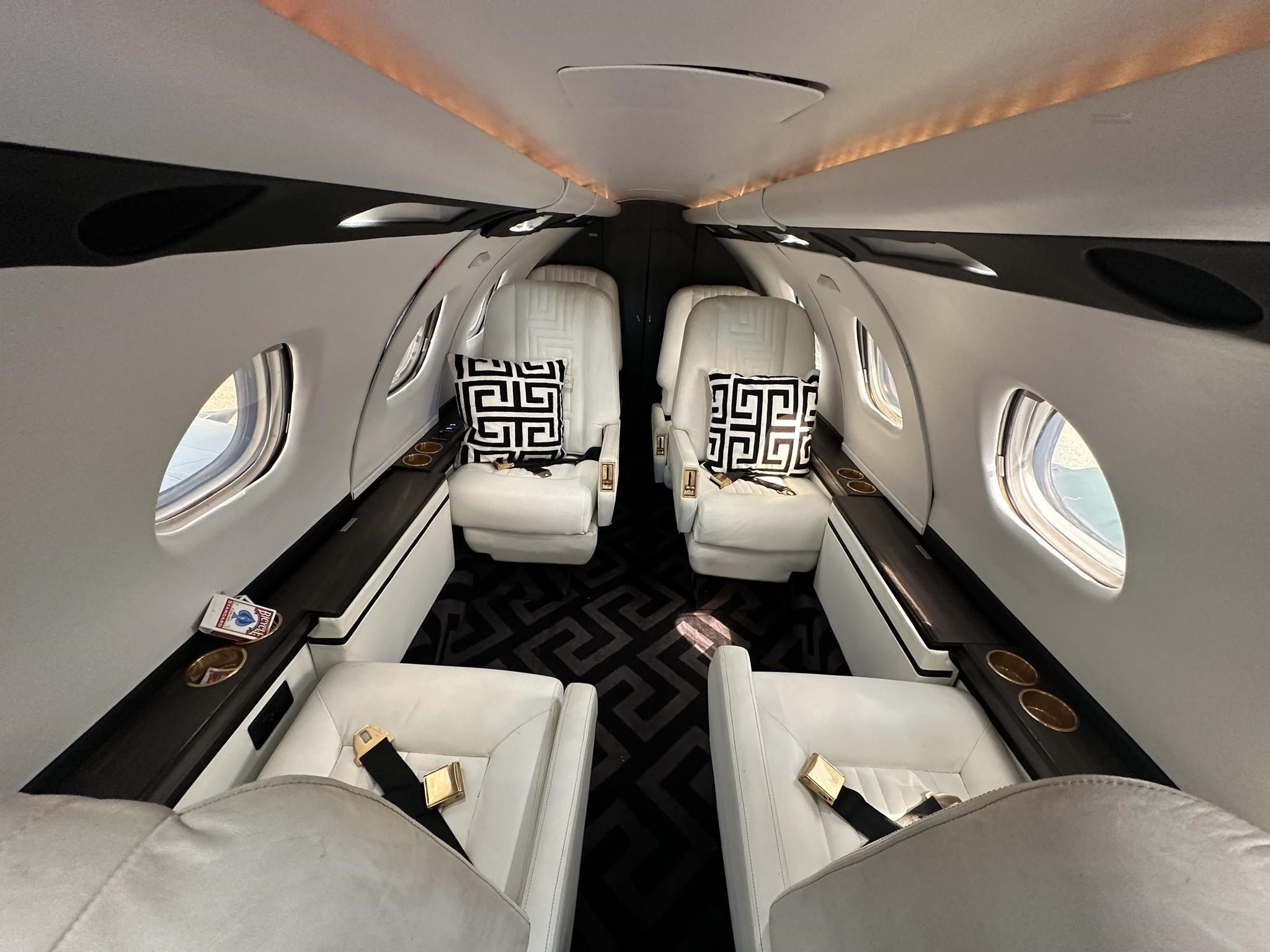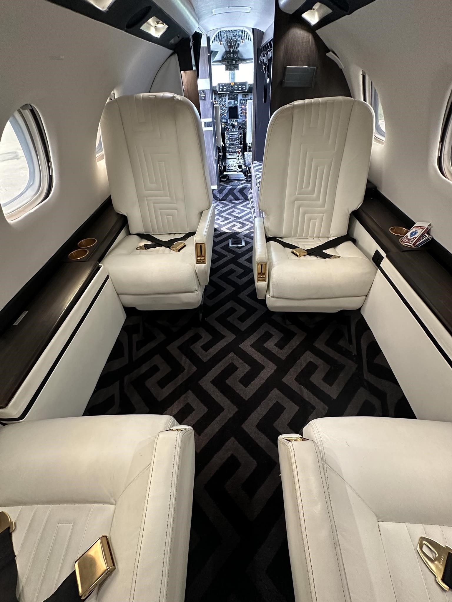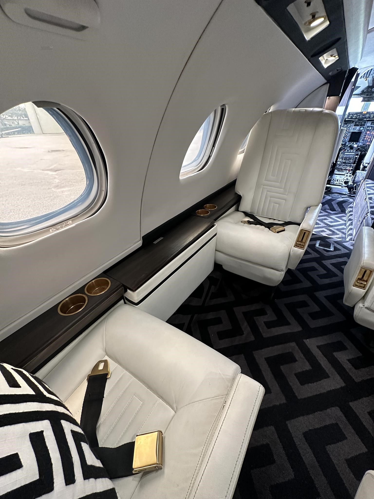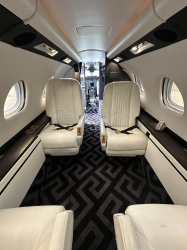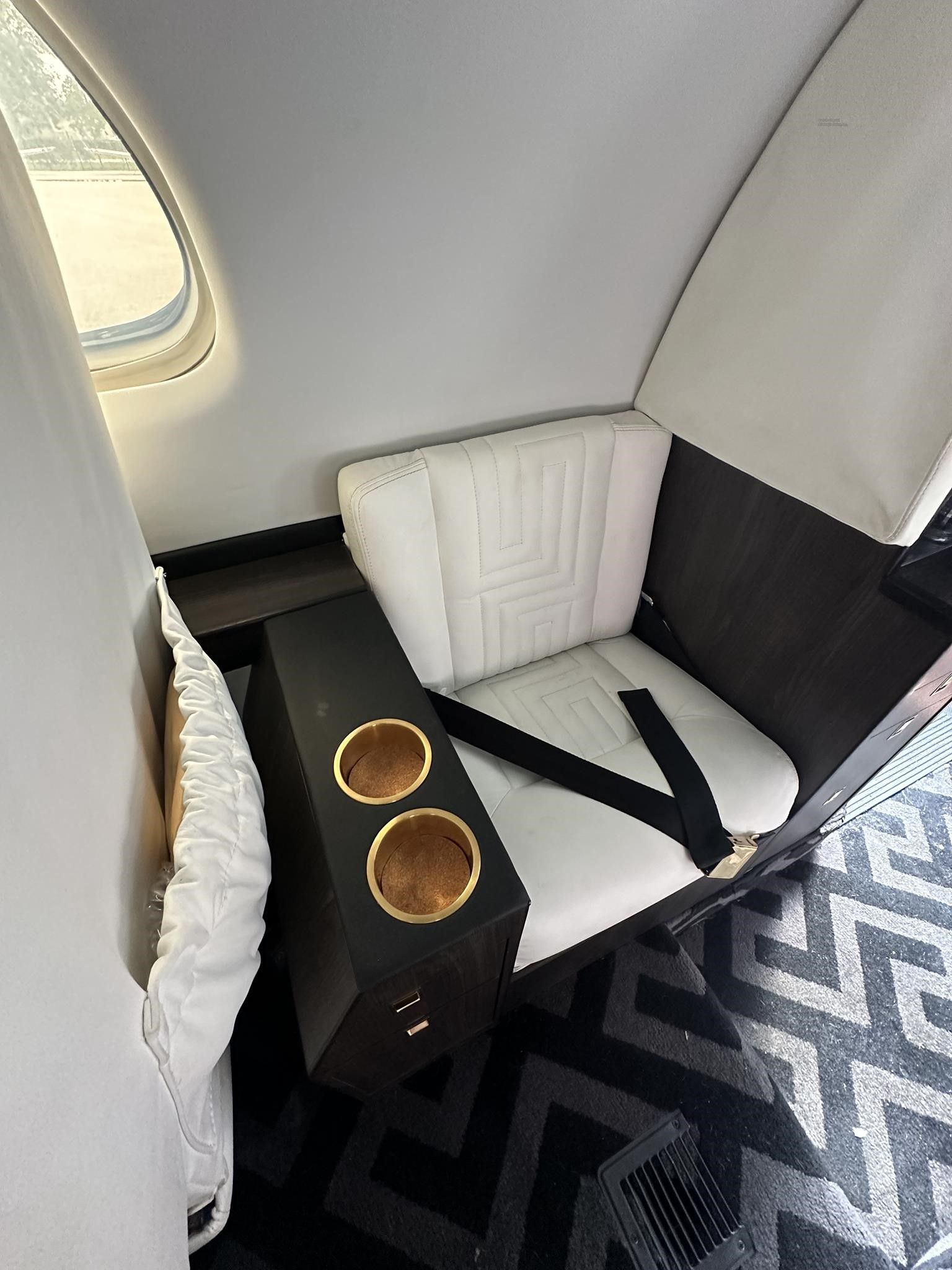 Lavatory - Yes Custom White Leather Versace Inspired Pattern. Off white headliner, Matching Trim and Carpet. Cabinets are Relaminated. All hardware is replated in with Gold accents. The interior shows like New. Eight passenger seating. 4 chairs in club arrangement and two aft forward facing chairs. Forwards side facing seat opposite galley and belted Lav. Extended forward baggage area. Super Sound Proofing. LED lighting in Cabin. 110v outlets in cabin and lav. Headliner and window panels with (Tapis, Ultraleather, ICE) side panels and seats with (GH, Aeronautica, Snow) Pilot and CoPilot seats in leather( GH, Aeronautica, Snow) and Sheepskin; (ASCO-Black 021) Carpet was replaced with (Hafner, Custom Greek Key, Black/Grey). Baggage compartment was recovered with TAPIS, Geneve, Black). Black accents were covered in (Perrone, Mirage GS, Ebony,MGS-4040) Insulation was replaced with Soundex. |