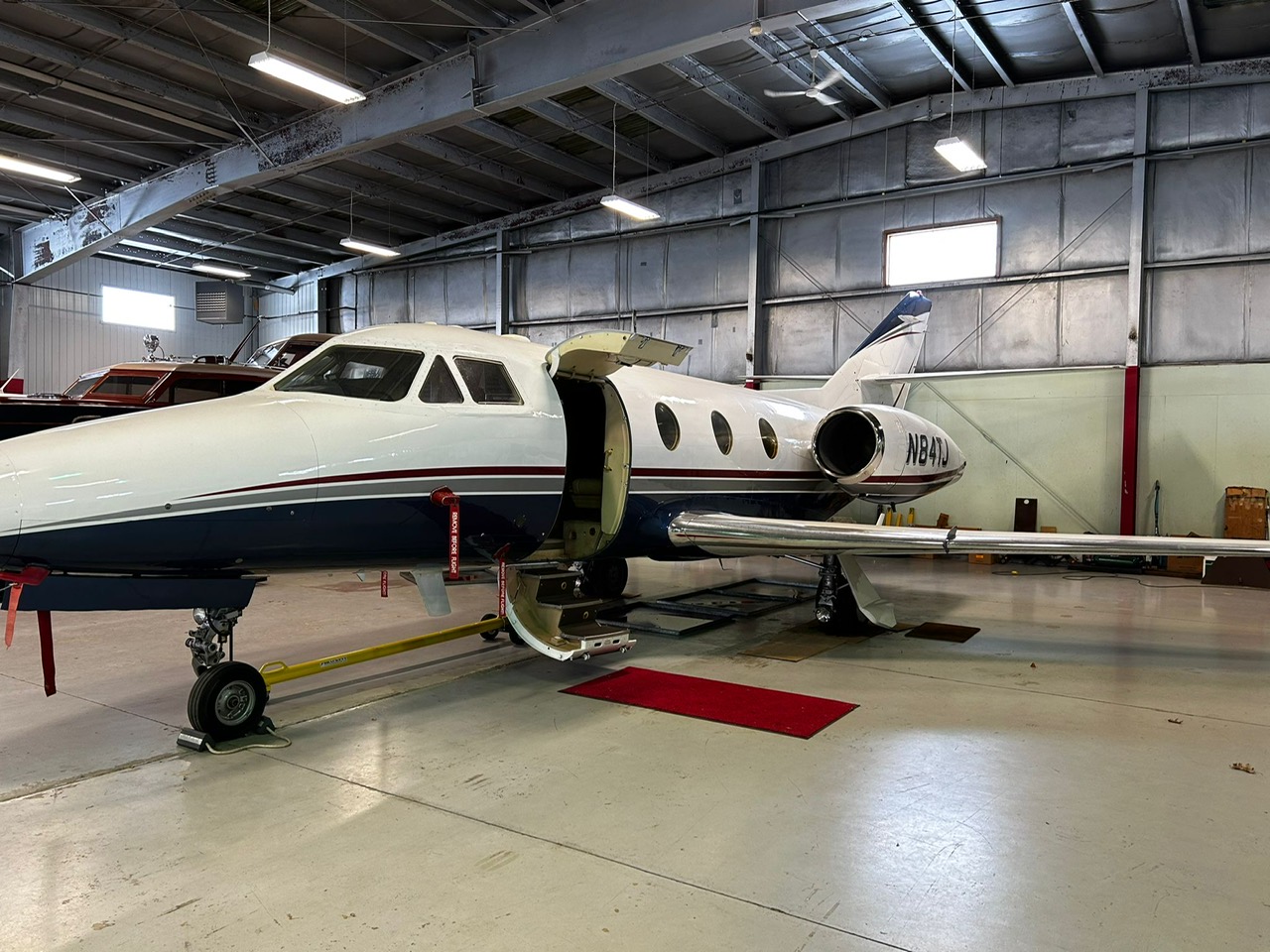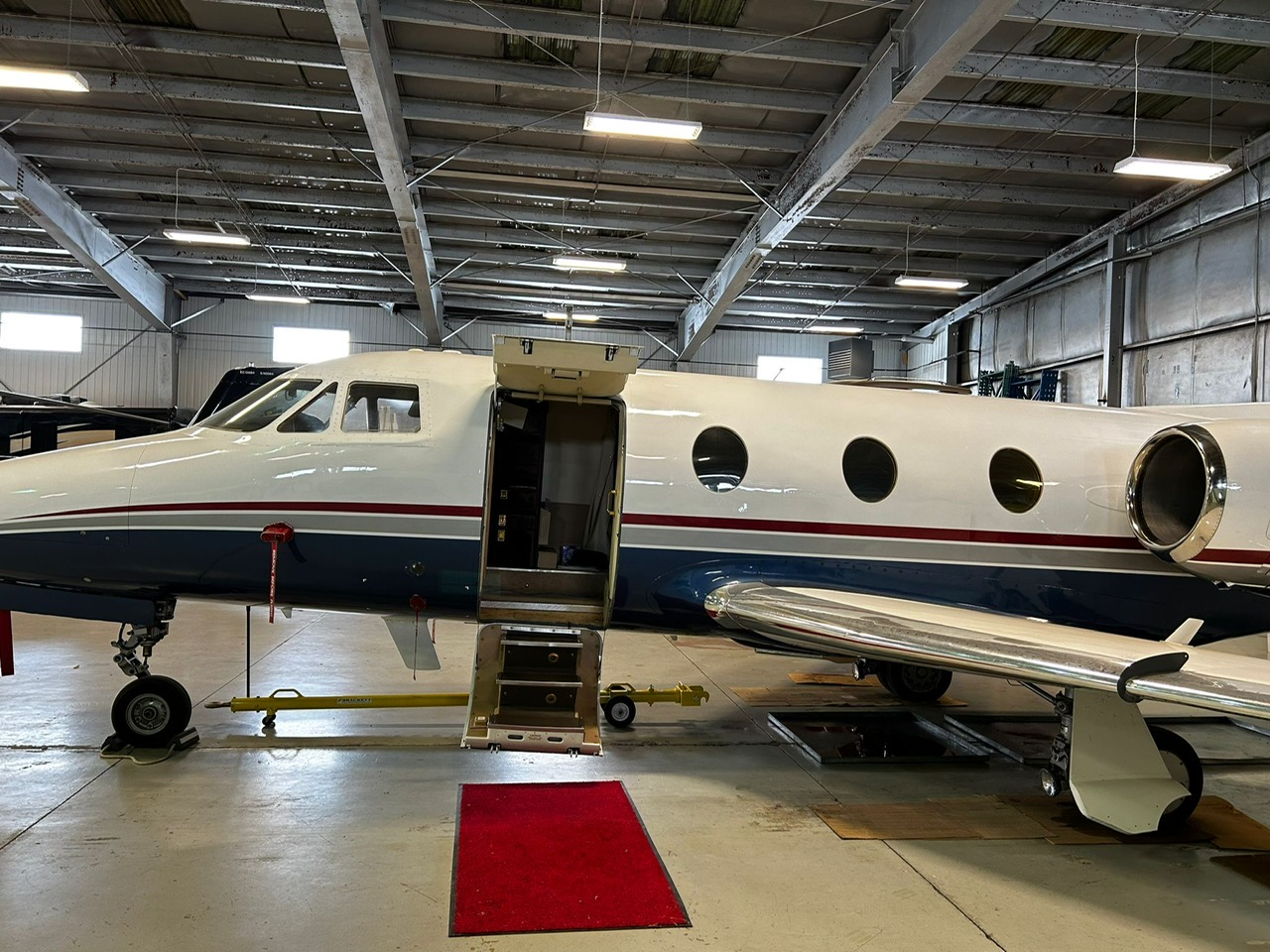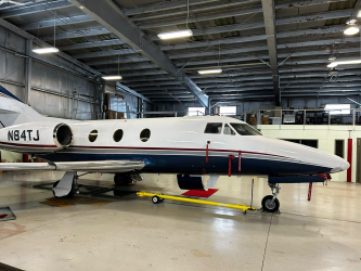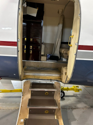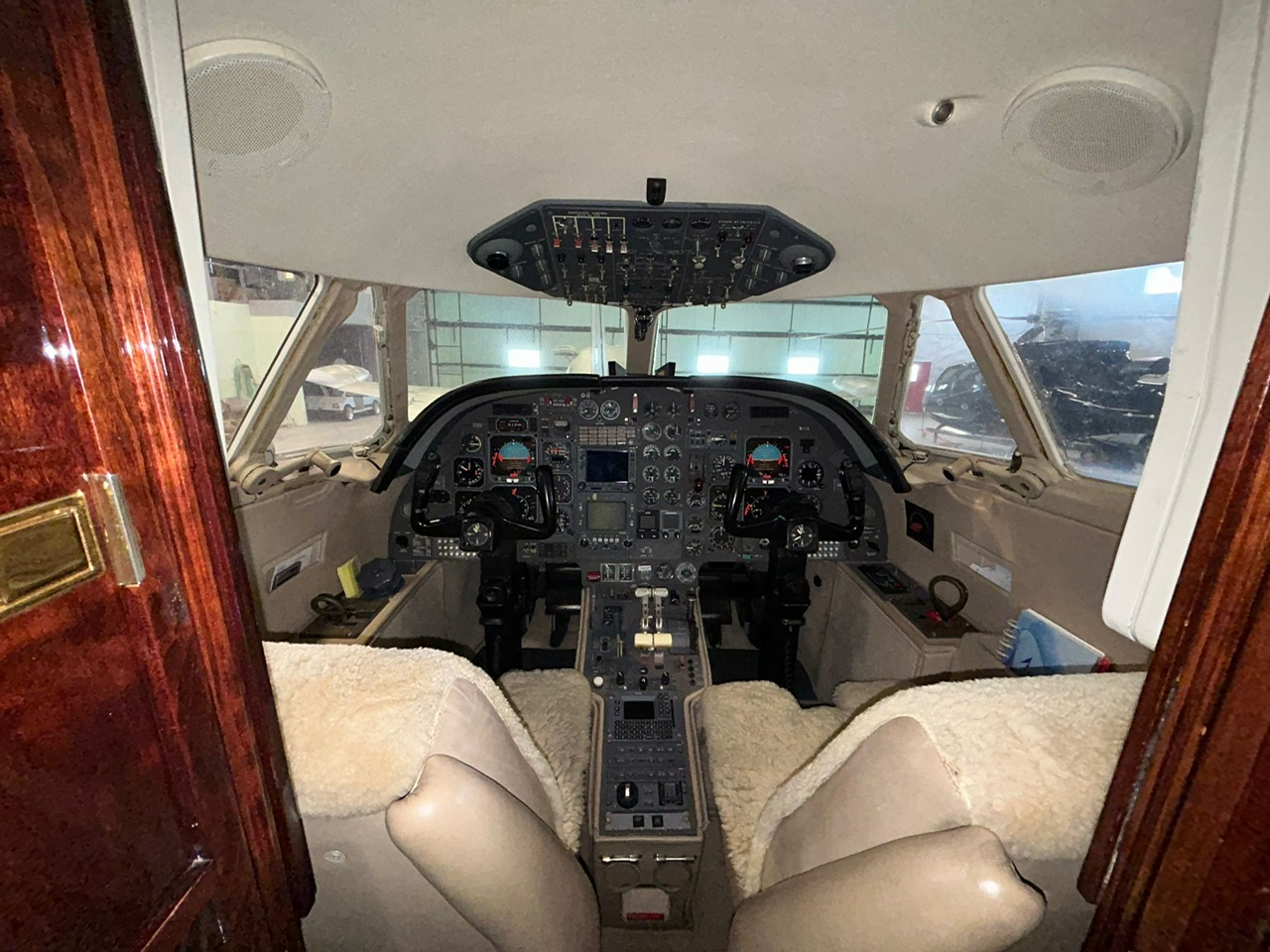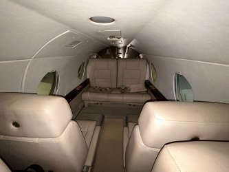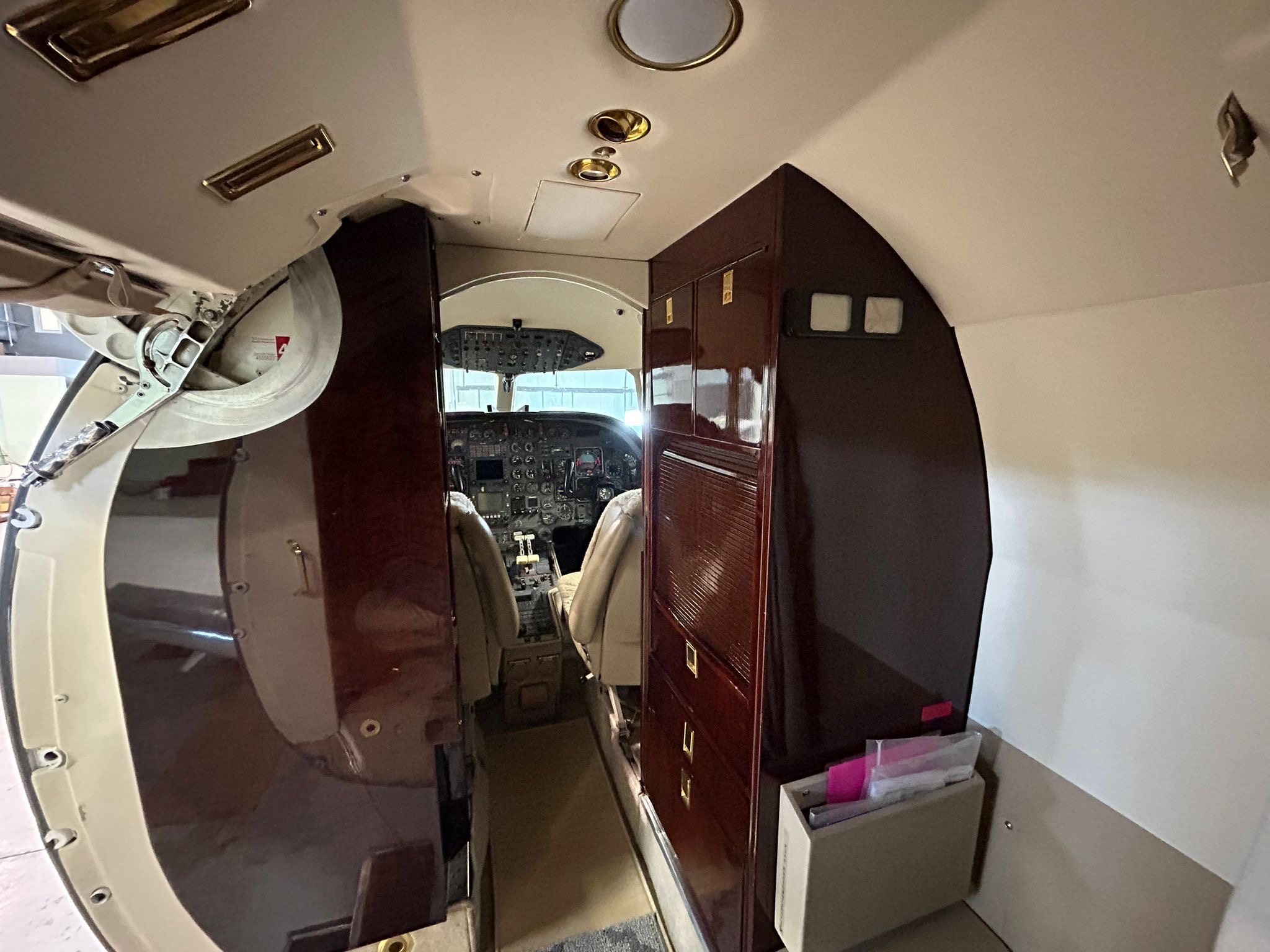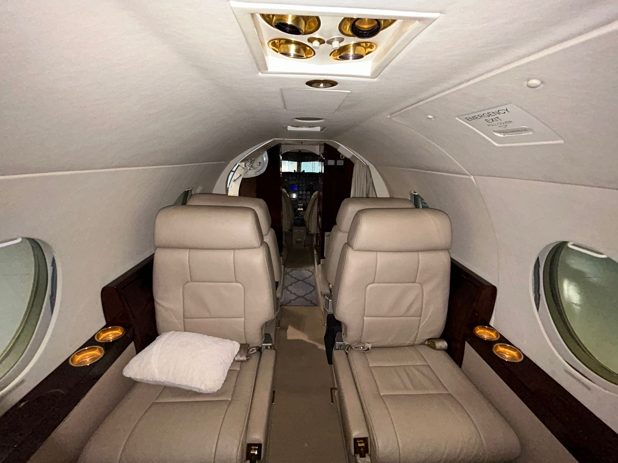 New custom 8 passenger interior as of 2006 consisting of tan leather, providing seating for eight passengers and two crew including an aft three-place divan, four captain chair with 180 degrees of swivel. A forward right hand refreshment center, cockpit privacy doors, forward toilet w/storage drawer and Mapco unit and two executive pull out tables all of custom high gloss cherry wood cabinetry and gold plated accents to complete this late model interior. |