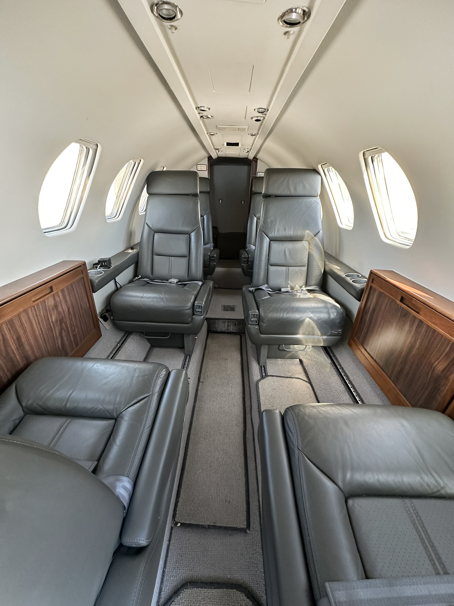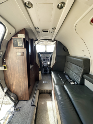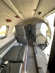 | Interior Redone in 2018. Nine Passenger Executive Configuration in Charcoal Leather, with Forward Divan, Four Place Club, Dual Forward Facing Club Seats, Belted Aft Lav Seat, Sheepskin Crew Seats, and Grey Carpet. Forward MAPCO Galley in Medium Rich Wood Cabinetry and Executive Writing Tables | |