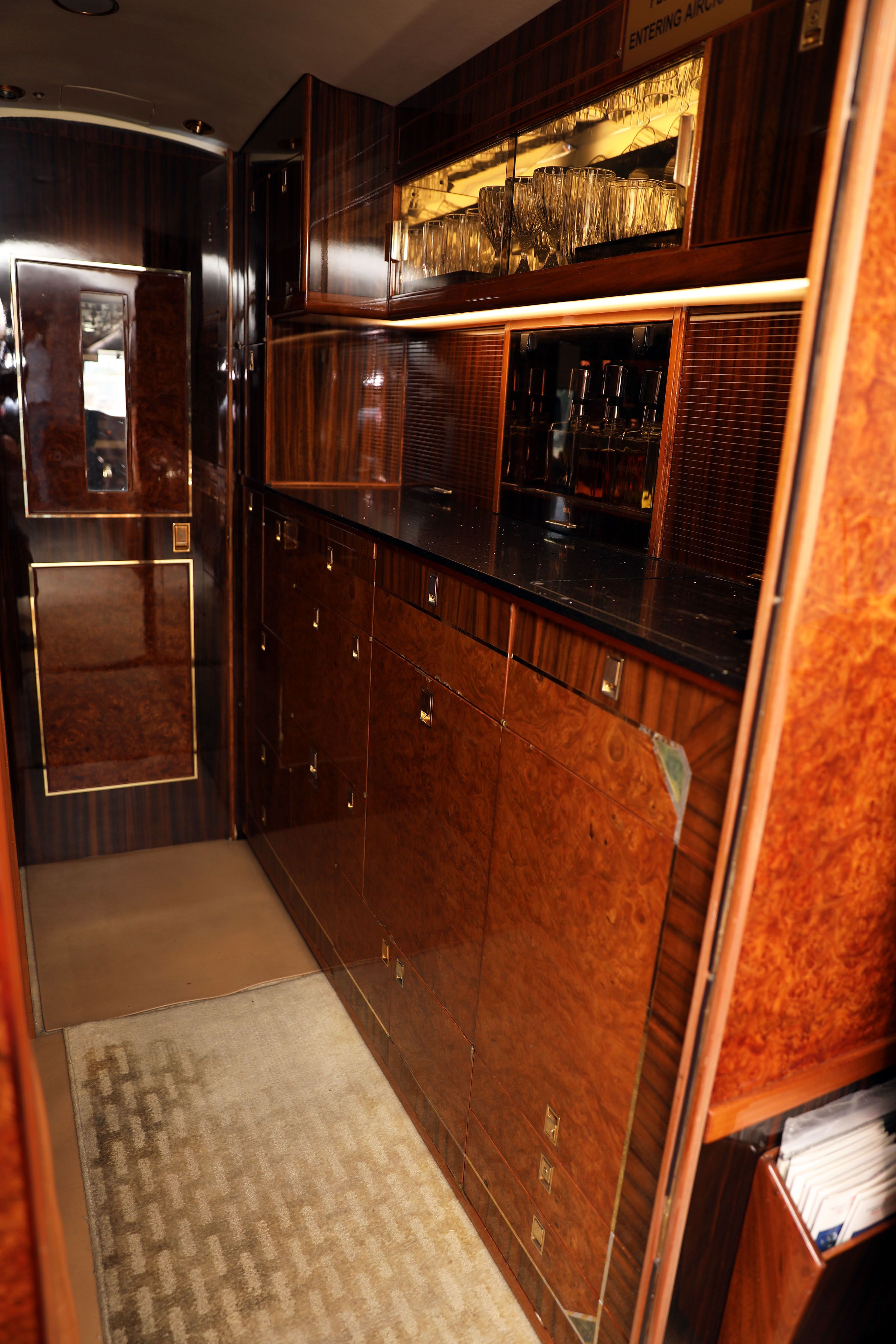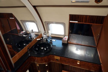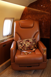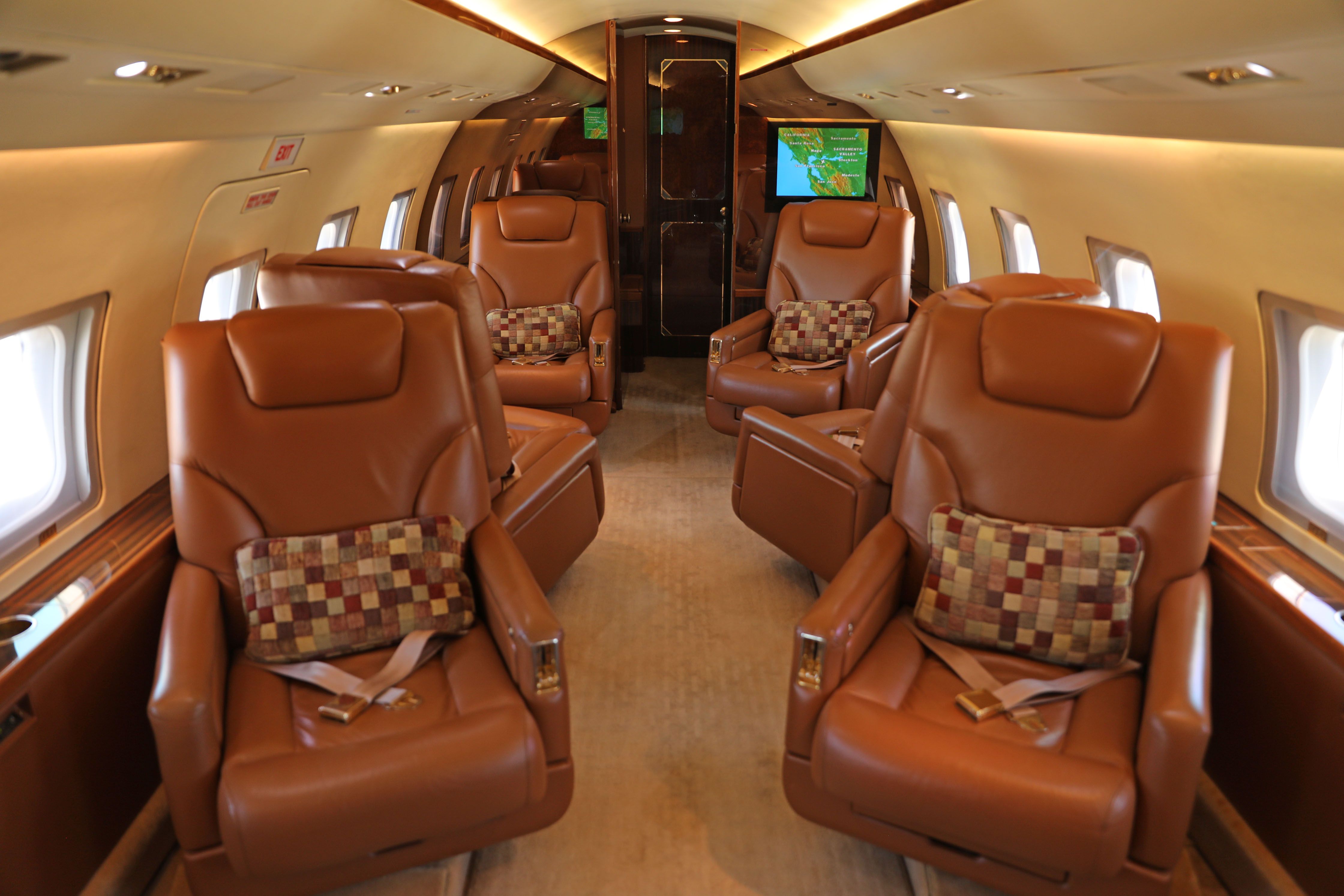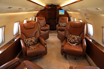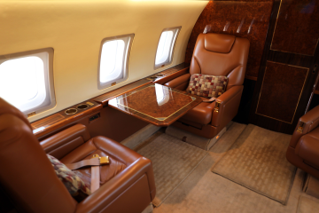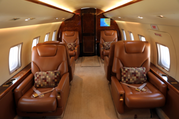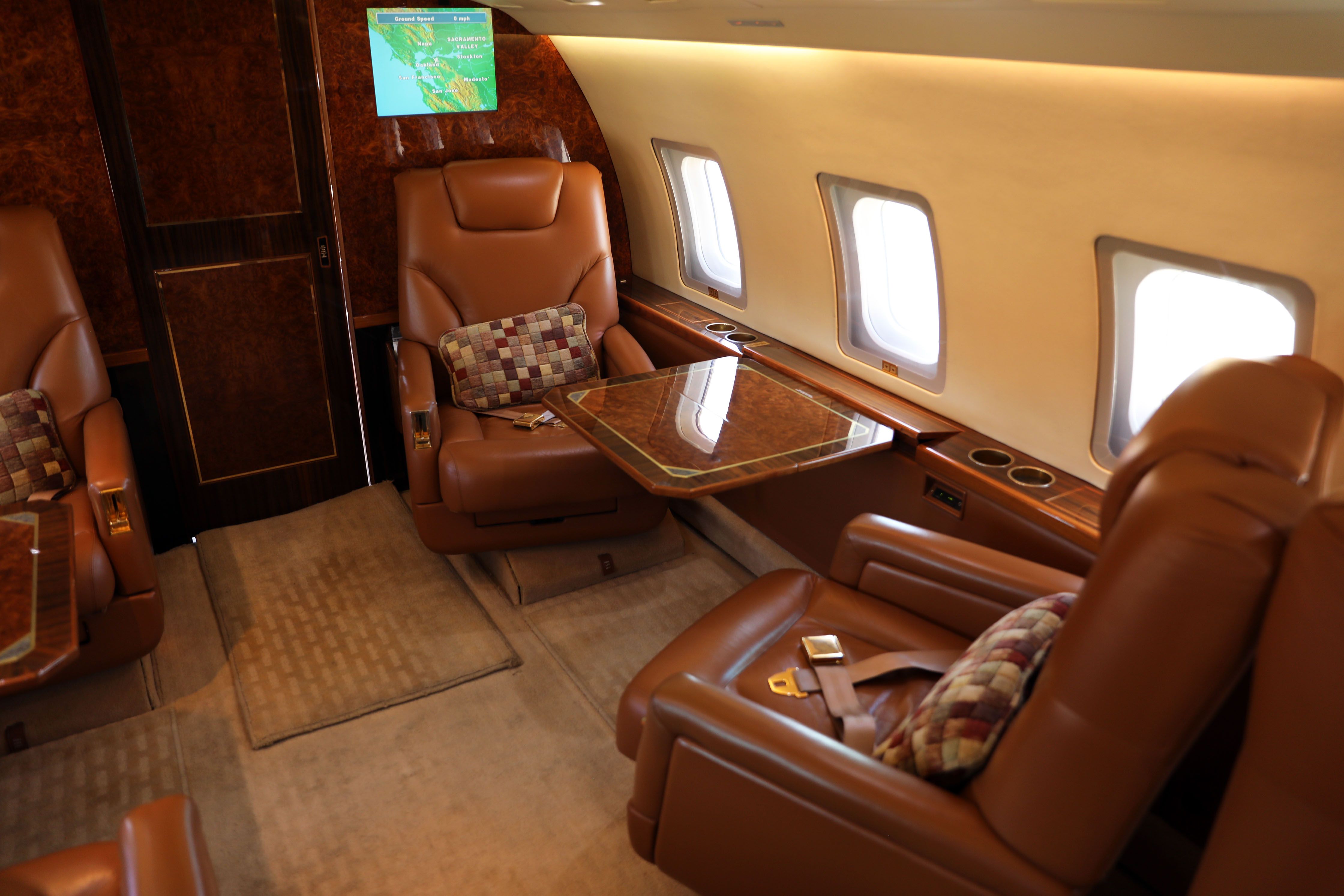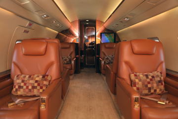 (2010 Refurbishment) Eight (8) passenger fireblocked interior featuring a super soundproofing 52Db Ultra Quiet Package which offers a superior environment. The forward cabin offers a fully equipped galley with a microwave oven, coffee maker, a convection oven and a cooling drawer. Moving into the cabin; there is a four (4) place club arrangement followed by a second four (4) place club. The interior finishes include light brown leather, medium light-colored high gloss veneer complimented by Gold colored plating and neutral carpeting. Aft Lavatory. |
