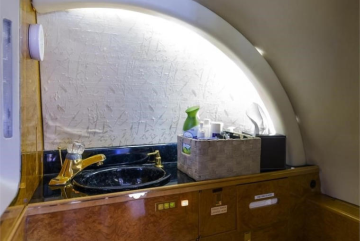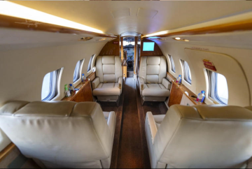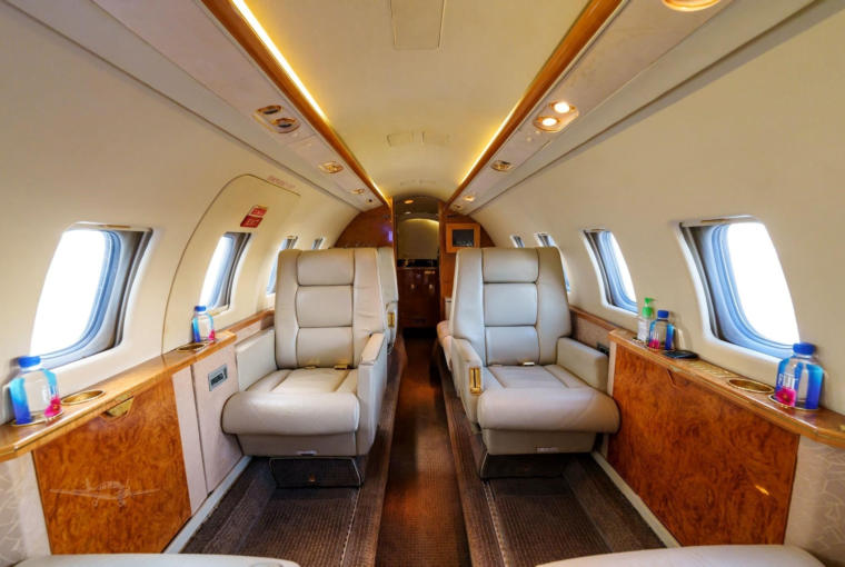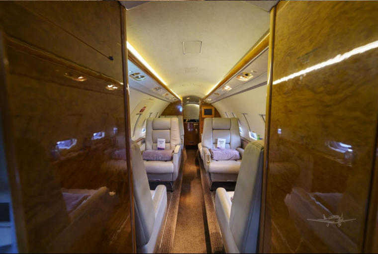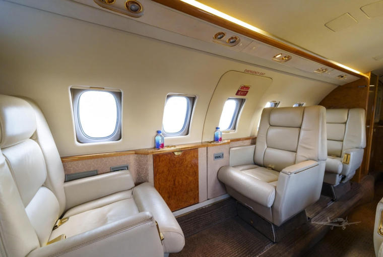 Configuration/PAX: Executive/7 passengers Seating: Fwd 4-place club, aft 2-place sidefacing divan opposite single fwd-facing seat Refreshment: Fwd galley Lavatory: Aft lav |