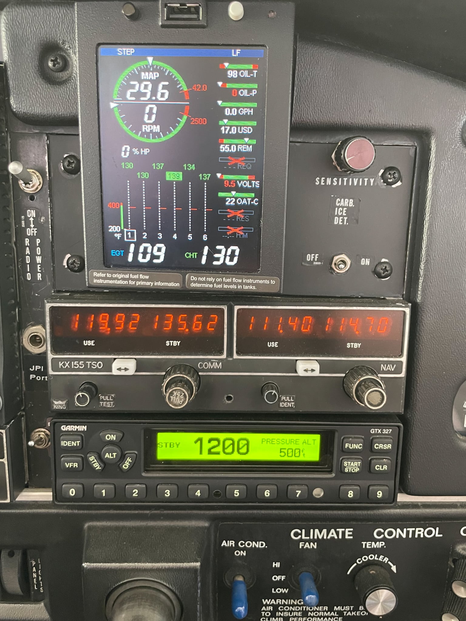 Aspen Evolution EFD1000 PFD with Synthetic Vision Garmin Flight Stream 510 Garmin GTN750 Touchscreen IFR GPS/NAV/COM Garmin GMA35 Remote Audio Panel (integrated in GTN750) Garmin GTX327 Transponder Garmin GDL88 ADS-B Solution Bendix-King KX155 NAV/COM Bendix-King KAP150 Autopilot with GPSS EDM JPI830 Engine Monitor RC Allen Digital Standby Attitude Indicator Electronics International V1-1A Digital Volts/Amps |