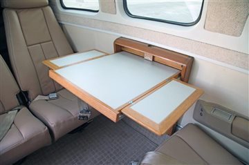 - 6 place executive seating in a rear club configuration - Writing table - Seats are finished in summer wheat leather with matching seatbelts - Cloud grey sidewalls - Off-white window moldings with GD window inserts - Pecan berber carpeting - New as of 6/25 |