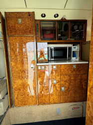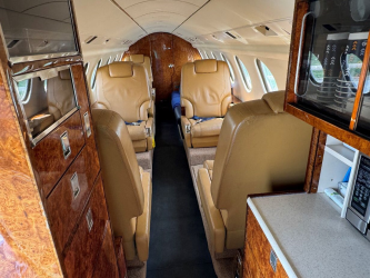 | Nine Total Seats, Covered in Tan Leather, Divan Covered in Blue Leather, Wood Done in Birdseye Maple in Excellent Condition, Forward Cabin Four Place Club Seating, Aft Cabin Seating Three Place Divan Opposite Two Club Seating – 9 Place total plus Cockpit Jump Seat, Forward Deluxe Galley, Aft Lavatory, Dual Monitors with DVD, Microwave Oven. GoGo WiFi, Brand New Interior Soft Goods Being Done Now! | |