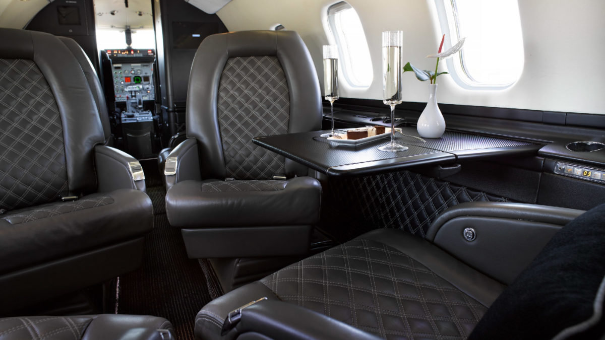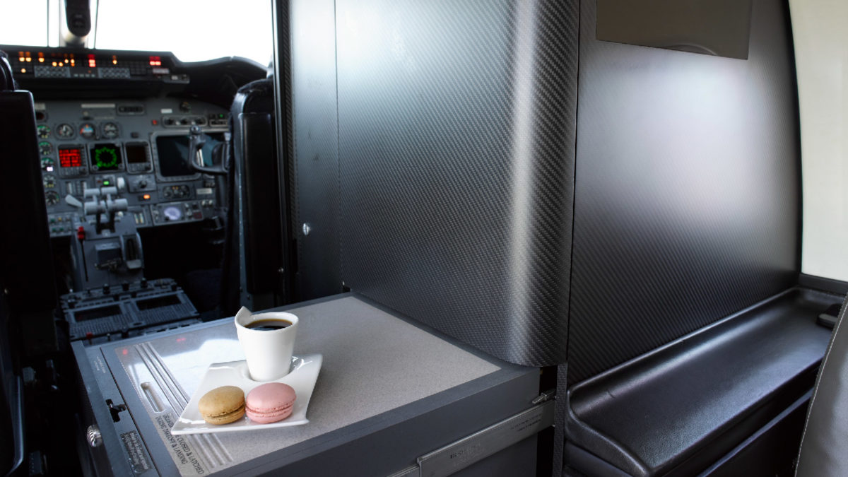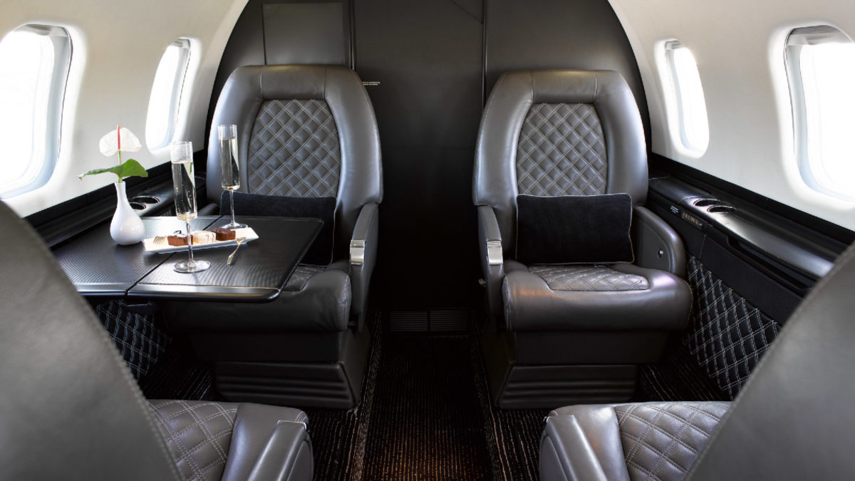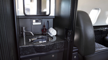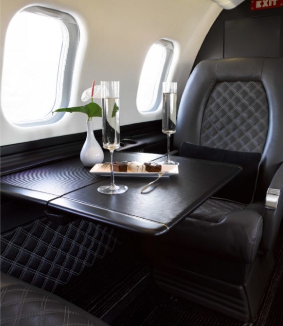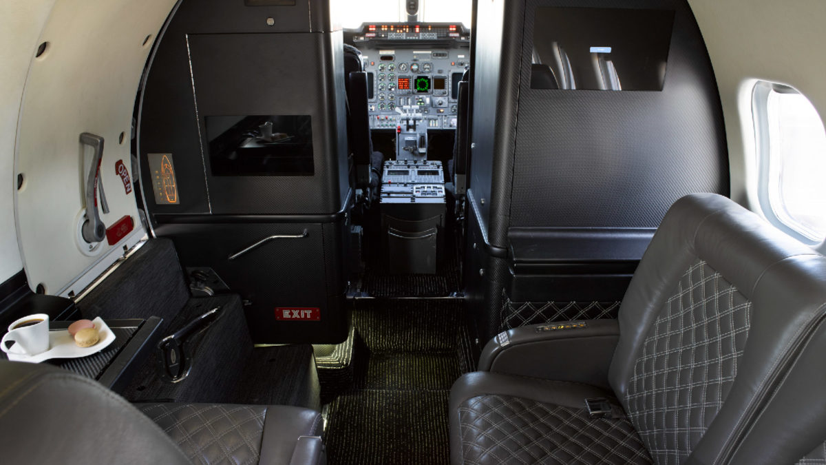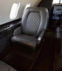 Executive 8 Passenger Floor Plan Contemporary & Unique Gray Double Diamond Stitched Leather Seating & Black Pin Stripe Carpeting Beautiful Carbon Fiber Matte Finish on Galley & Bulkheads Forward Galley Includes High/Low Heating Oven, Nespresso Pixie Espresso Machine w/ Capsule Tray, and Dual Cooler Drawers Airshow 500 w/ Dual Displays, Cabin Entertainment with Altos Sound System, Bose Bluetooth Connectivity, Dual iPad Mounts w/ Charging port, and XM radio. |