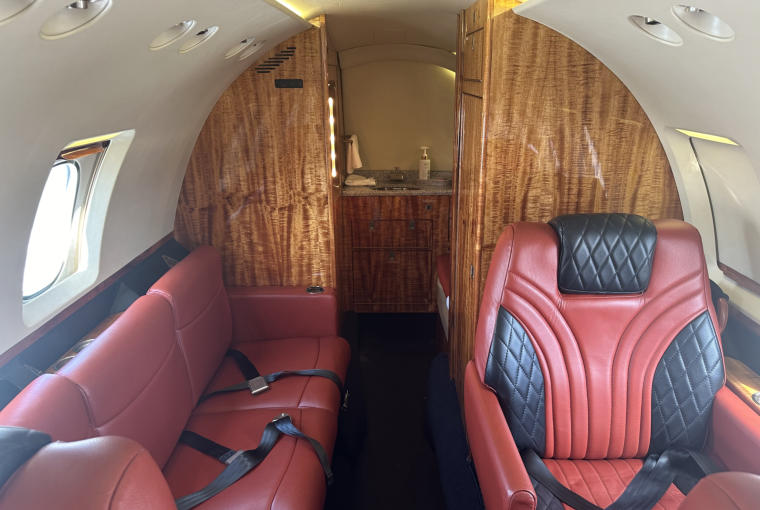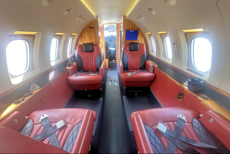 New in April 2022 Executive 8 pass configuration Done in two tone saddle leather Five single seats & 3-place divan Full forward galley, plus convection oven High-gloss Maple veneer cabinetry Wired for Airshhow 400 w/dual monitors CD player AirCell Wi-Fi (U.S. only) w/text & talk Storage: Forward full-size baggage area, Lavatory: Aft full size lavatory WiFi: ATG-5000 Gogo |