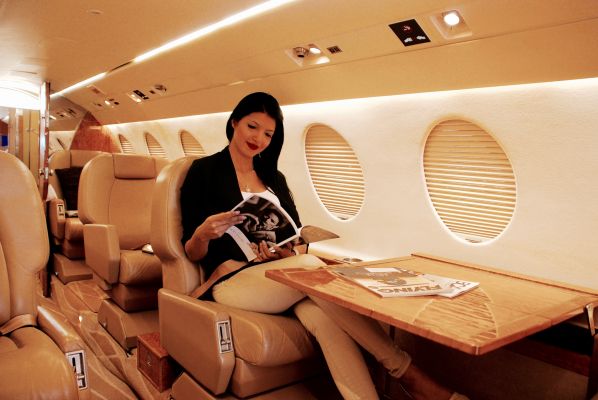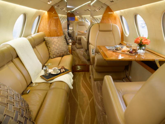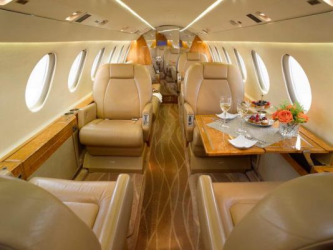 | Refurbished- Elite Fortune 500 styling in a deluxe 9 passenger configuration. Taupe premium hide leather, (4) Forward facing club seats, (2) rear facing club seats, (3) place divan in the aft ultimate comfort. | |