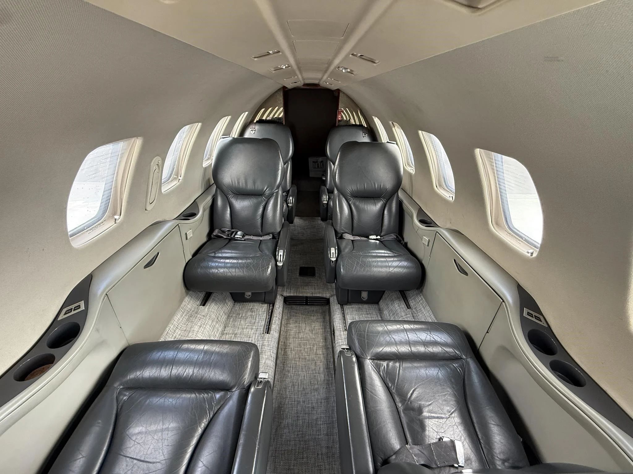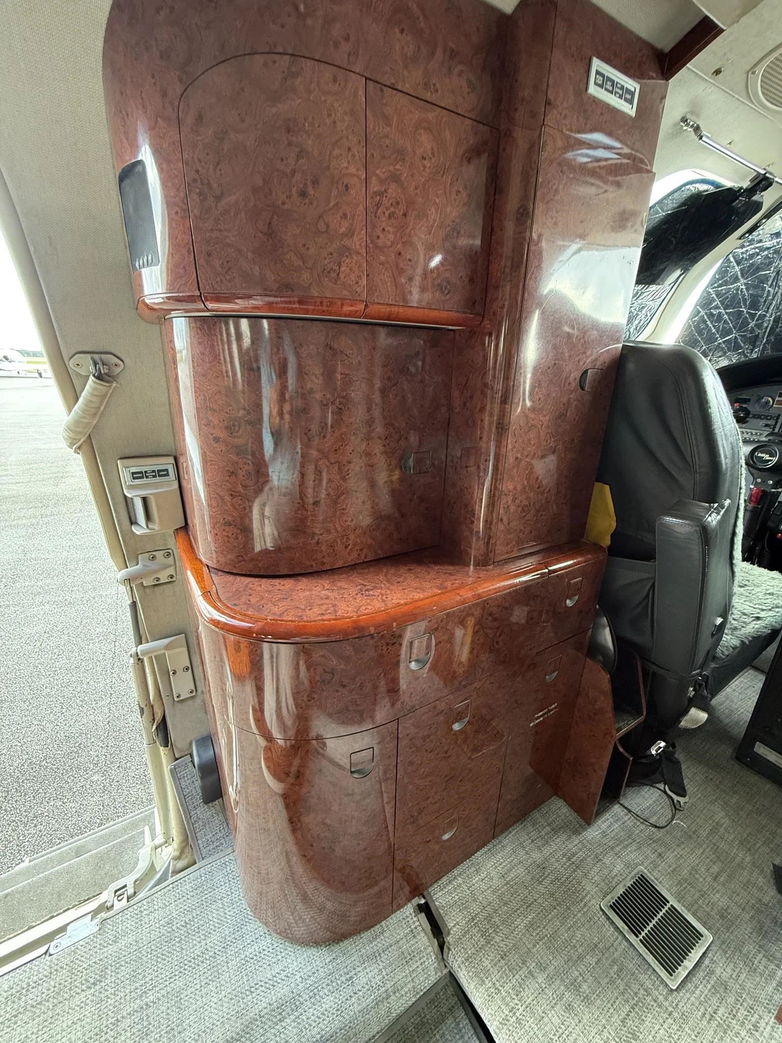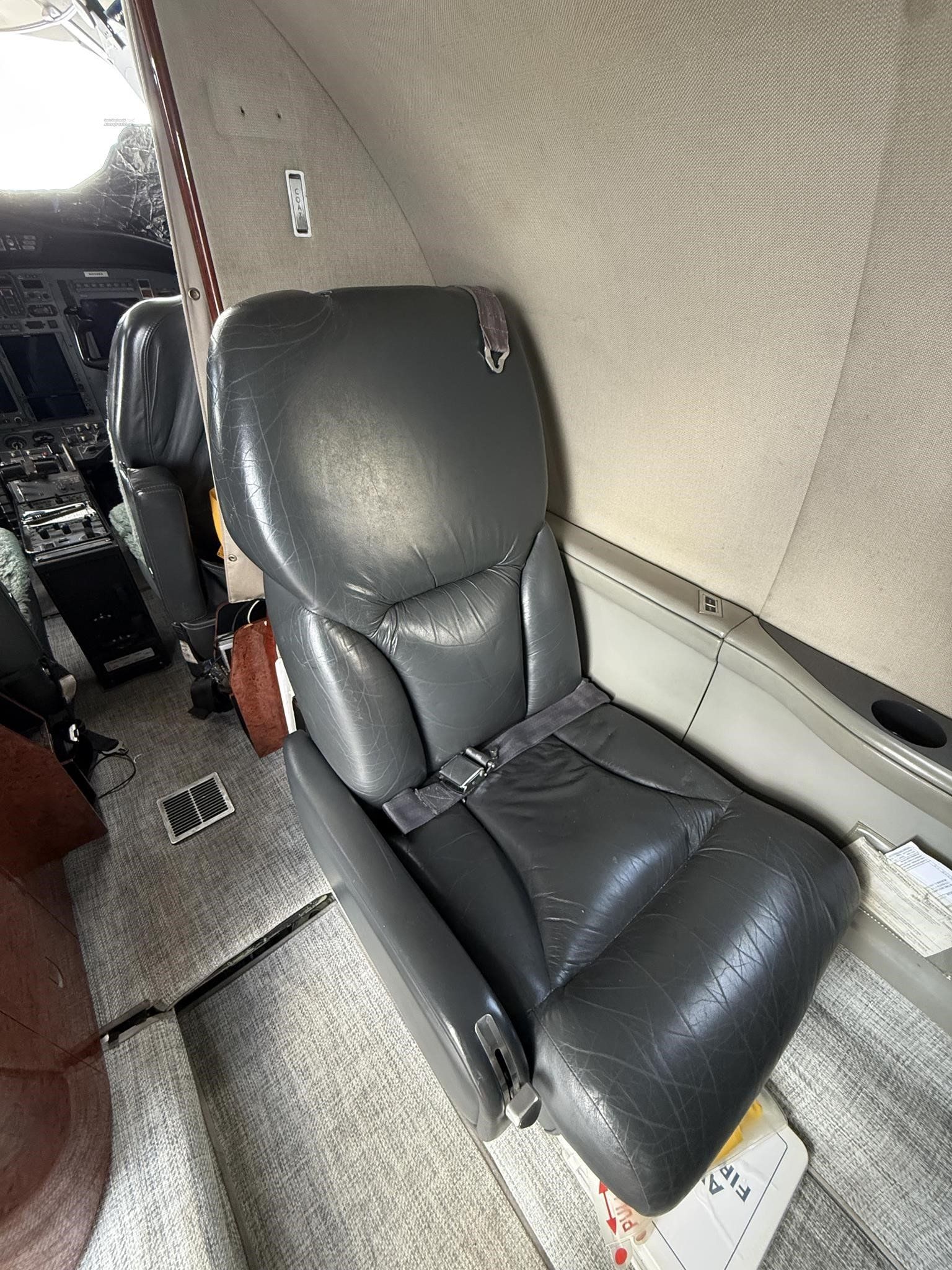 | Executive 8 Passenger Configuration with Leather Seating, Forward Galley High Gloss Wood Veneer Cabinetry, Gray Carpeting, B&D Cabin Information Display, Aero Wave 100 Active LGA System, and aft Belted Lavatory. | |