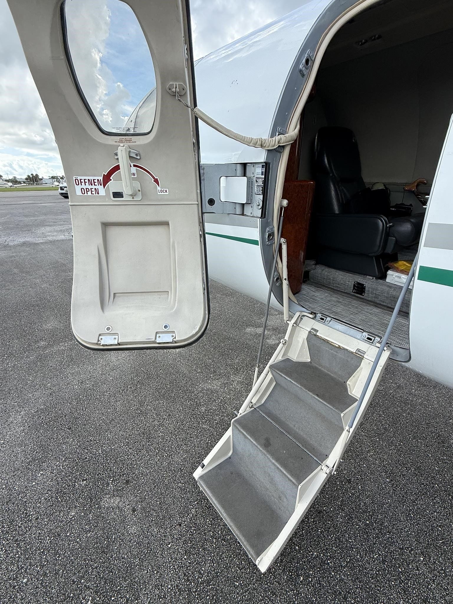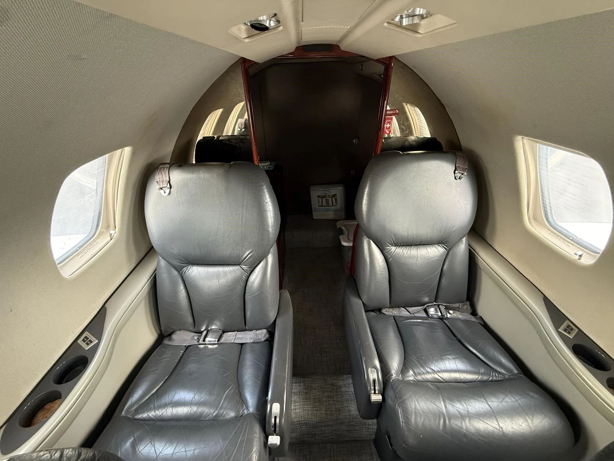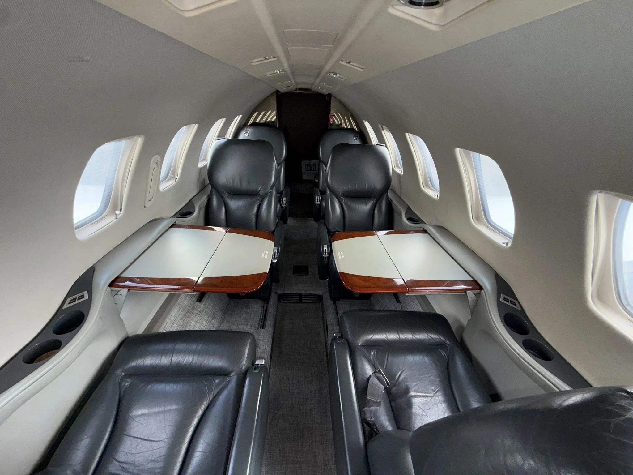 | Executive 8 Passenger Configuration with Leather Seating, Forward Galley High Gloss Wood Veneer Cabinetry, Gray Carpeting, B&D Cabin Information Display, Aero Wave 100 Active LGA System, and aft Belted Lavatory. | |