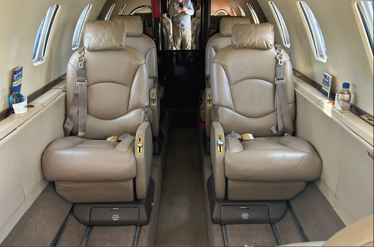 By Duncan Aviation, Battle Creak, MI in 2008 Configuration/PAX: Executive/7 passengers Seating: Light tan leather seating, fwd single side-facing seat, mid-cabin 4-place double club, dual aft single fwd-facing seats Headliner: White headliner Sidewalls: White upper sidewalls Carpet: Tan patterned w/blue accents carpeting Refreshment: Fwd galley Entertainment: Airshow 4000 Accessories: 110-volt AC outlets Storage: Fwd & aft storage cabinet, aft closet Lavatory: Aft lav |