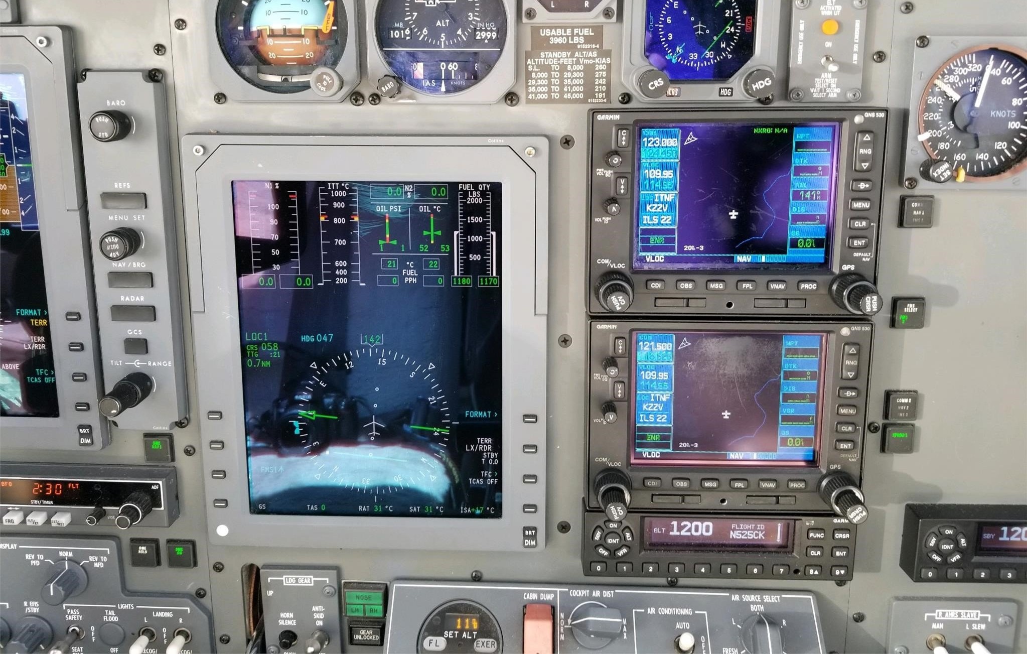 ADS-B equipped WAAS Collins Proline 21 2 Tube Dual Garmin 530 WAAS Dual Garmin ADSB Transponders ADSB Traffic and Weather Color Radar WX-1000 Stormscope Universal UNS-1 FMS Sky Watch Traffic |