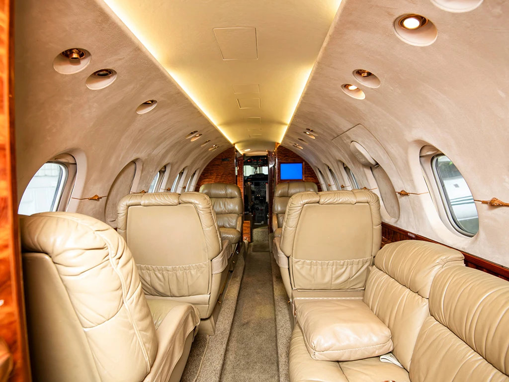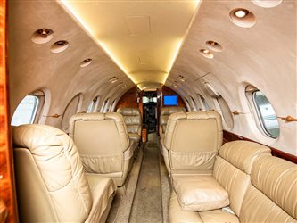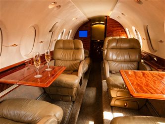 Configuration/PAX: Executive/8 passengers Seating: Fwd club seating, aft RS 3-place divan & LS fwd-facing chair upholstered in biscuit leather Carpet: China Sea gray carpeting Fwd LS refreshment center w/Corian countertop & microwave Cabinetry/Wood: High-gloss Australian walnut cabinetry Business: Computer terminal, fax port Accessories: 24-karat gold satin metal-plating, drop-down armrests Storage: Fwd RS baggage area Lavatory: Yes |