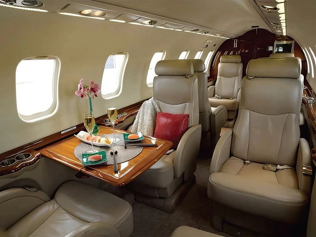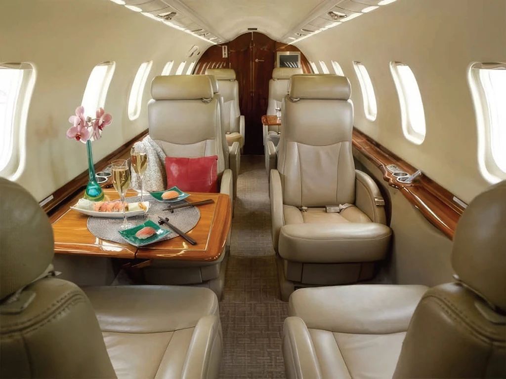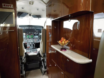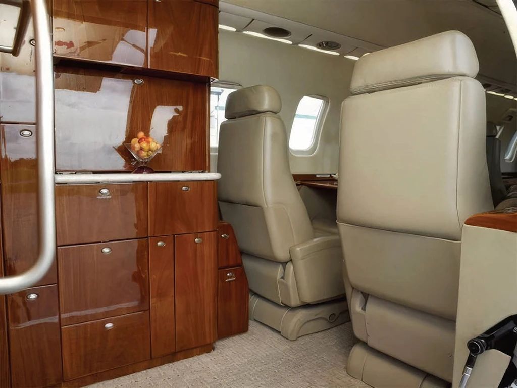 Configuration/PAX: Executive/9 passengers Accessories: Brushed nickel satin hardware, 115-volt AC outlets, pleated fabric window shades, PSU indirect lighting, dropped aisle accent lighting Seating: Tan leather double club seating, tan sheepskin-covered crew seats, belted lav seat Entertainment: Cabin entertainment system w/10-disc CD changer & DVD, Airshow 400, forward & aft monitors. Cabinetry/Wood: High-gloss wood veneer w/leather accent Lavatory: Belted flushing aft lav w/stowable pocket privacy doors Air Conditioning: Keith Freon Carpet: Wool accent carpeting Headliner: Off-white Tapis Ultraleather headliner |
