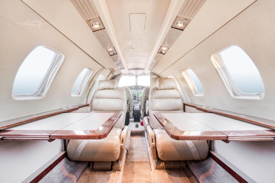 | Center four place club with two executive writing tables, a forward belted seat and an AFT belted Lav. The interior is finished in tan leather with complementary carpet, light beige interior, stretched wool window reveals and dark wood grain. Partial refurbishment September 2016. | |