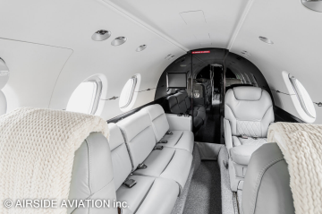 Interior Refurbished in 2022. 9-passenger executive configuration. Forward 4-place club, aft left-side 3-place divan, aft right-side forward-facing seat, belted flushing aft lav. Forward refreshment galley adjacent to entry door; 33 cu. ft. baggage/storage across from entry |