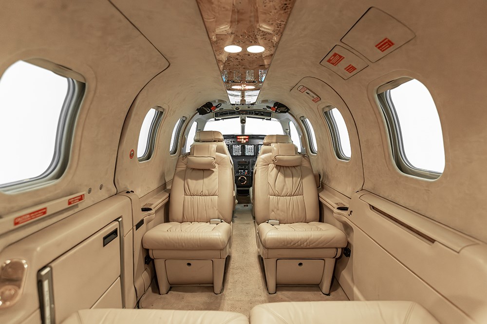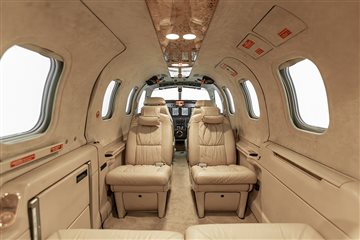 | Executive six seat interior, tan leather seating with tan sidewalls, high-gloss wood trim with retractable working table, baggage compartment with straps and net. | |