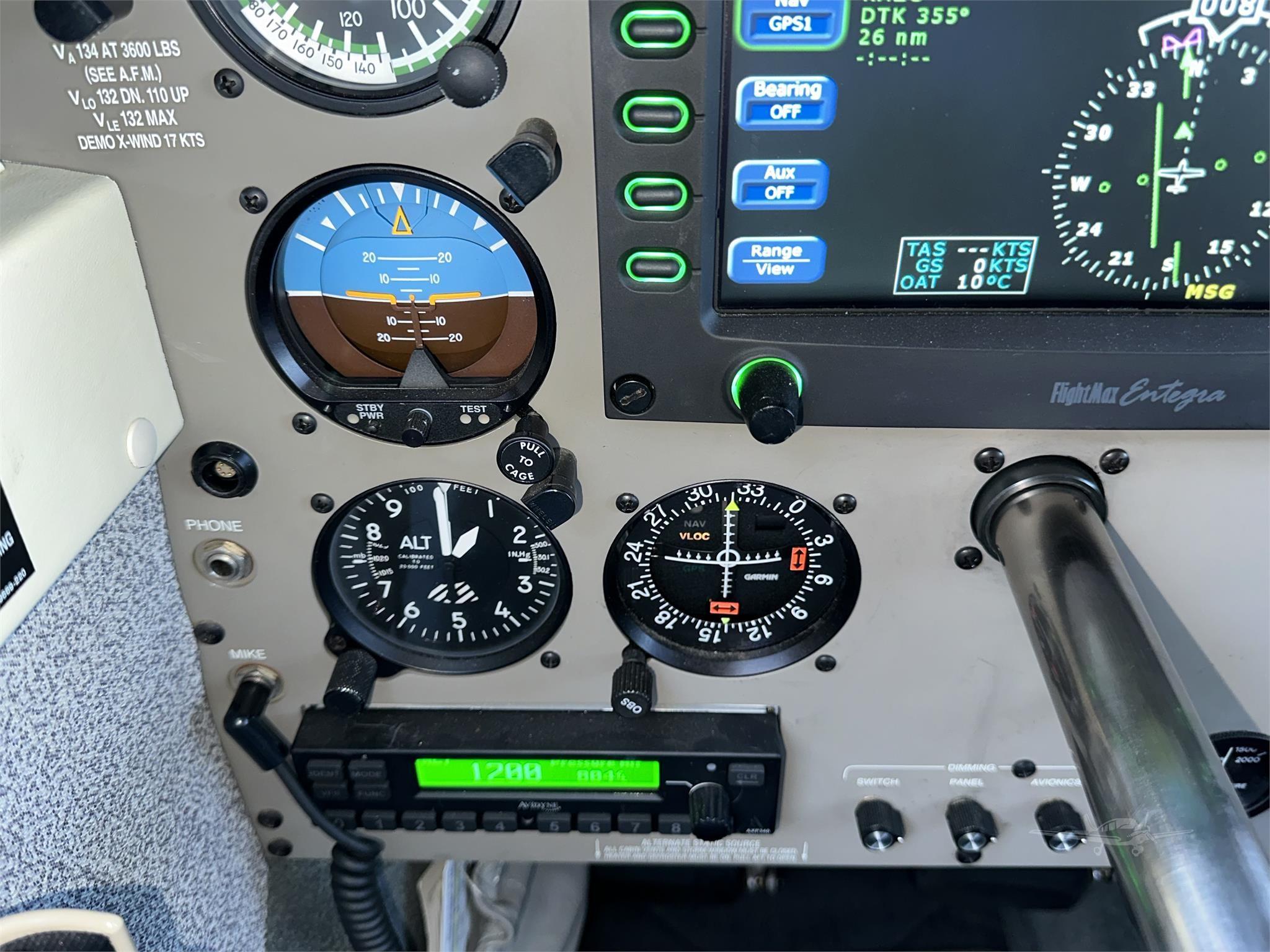 S-TEC 55X Flight Control System with ST-361 FLIGHT DIRECTOR Altitude Pre-Select Avidyne FlightMax Entegra Integrated GLASS PANEL Flight Deck featuring: 1. Entegra EXP-5000 PFD – (Primary Flight Display) 2. FlightMax EX-5000 MFD – (Multi Function Display) 3. Stand-By Flight Instrumentation 4. E-Max Engine Indicating System Avidyne IFD-440 GPS / COM / NAV Featuring Synthetic Vision – (WAAS Approved) Avidyne IFD-440 GPS / COM / NAV Featuring Synthetic Vision – (WAAS Approved) Garmin GI-106A VOR / Glideslope Indicator Garmin GMA-340 Audio Panel with (3) Light Marker Beacons Avidyne AXP340 ADS-B Compliant Transponder – (ADS-B OUT) Stratus 3 ADS-B IN Solution WX-500 Stormscope Skywatch 497 Active Collision Avoidance System |