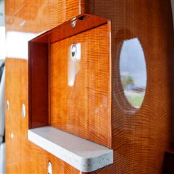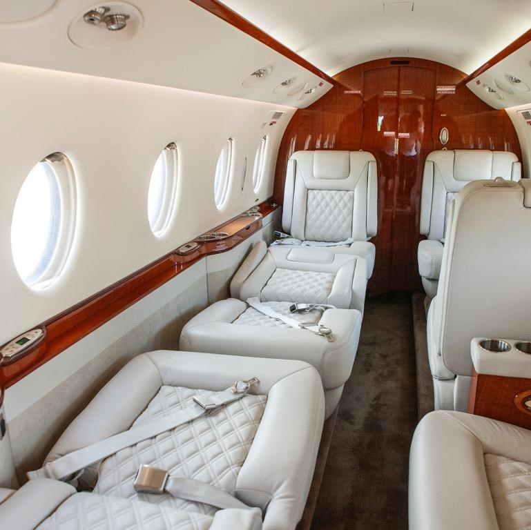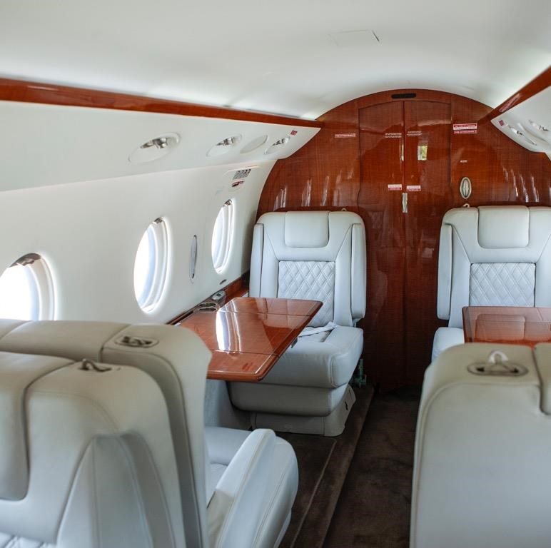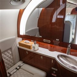Configured for eight passengers Aft cabin: Four-place club seating Forward cabin: One forward-facing seat opposite a two-place side-facing divan Aft lavatory: Includes a belted seat for additional occupancy Includes a sink Features a belted lavatory seat that can be used as an additional passenger seat In-flight entertainment: RosenView LX video system, displays aircraft position and flight data on a 10.4” LCD monitor mounted on the forward right-hand bulkhead Media playback: Dual DVD player Connectivity & Power: Six 110VAC cabin outlets Iridium satellite phone Galley: Dual heated liquid containers Soda can storage compartment Ice drawer Trash container Multiple general storage compartments |