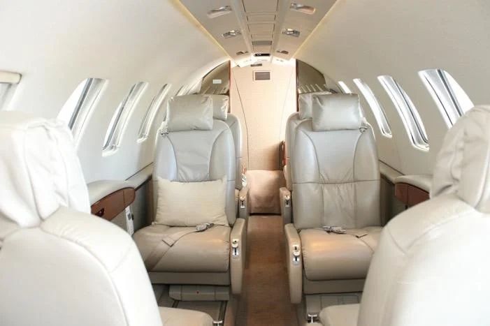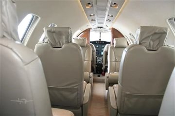 | EXECUTIVE INTERIOR FEATURING RHS FORWARD REFRESHMENT CENTER, FORWARD FOUR PLACE CLUB. TWO AFT FORWARD FACING SEATS AND AFT LAVATORY WITH BELTED FLUSHING SEAT. COLOR SCHEME CONSISTS OF BEIGE LEATHER, LIGHT BROWN CARPET, AND LIGHT-MEDIUM COLORED WOODWORK. | |