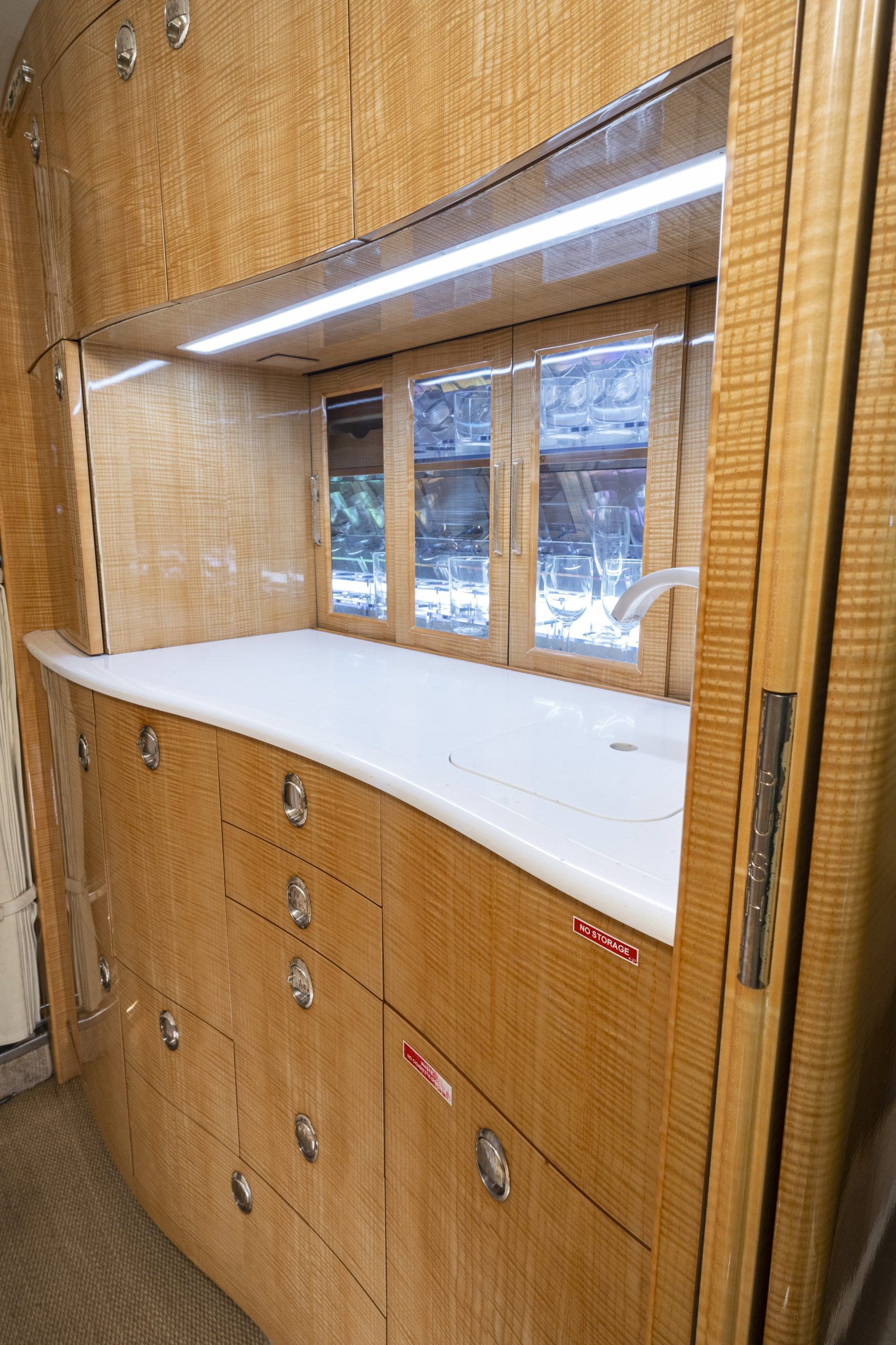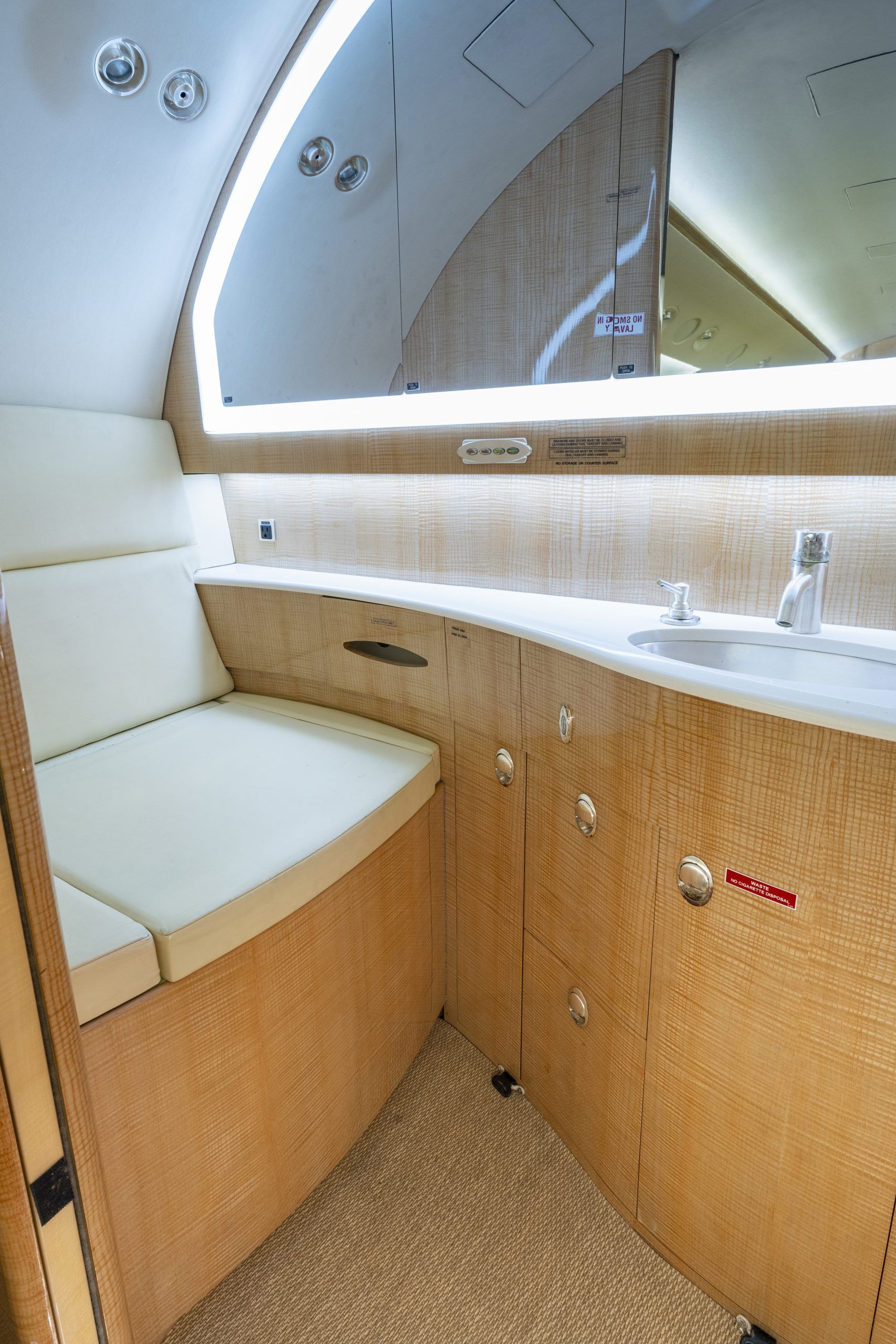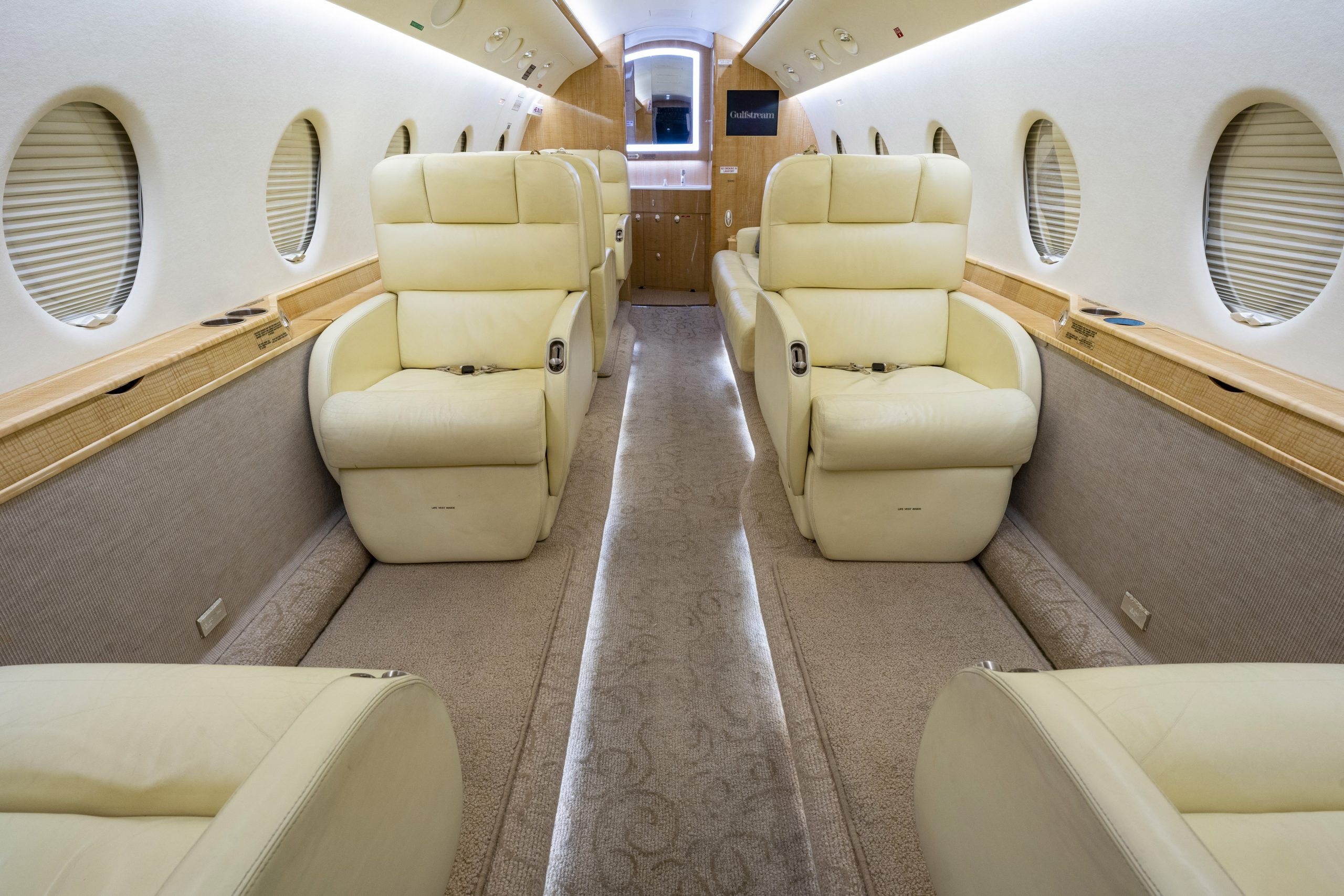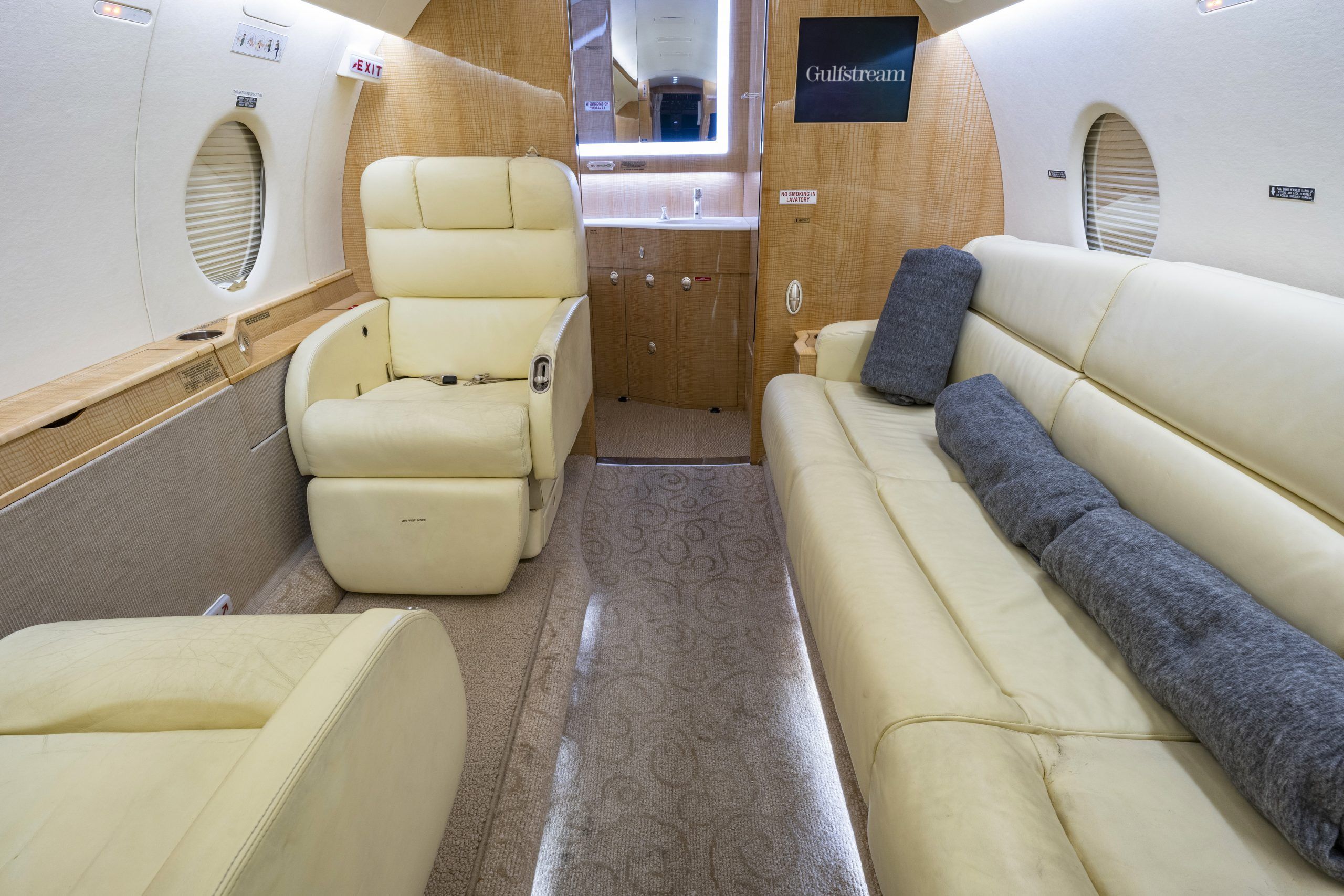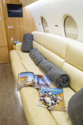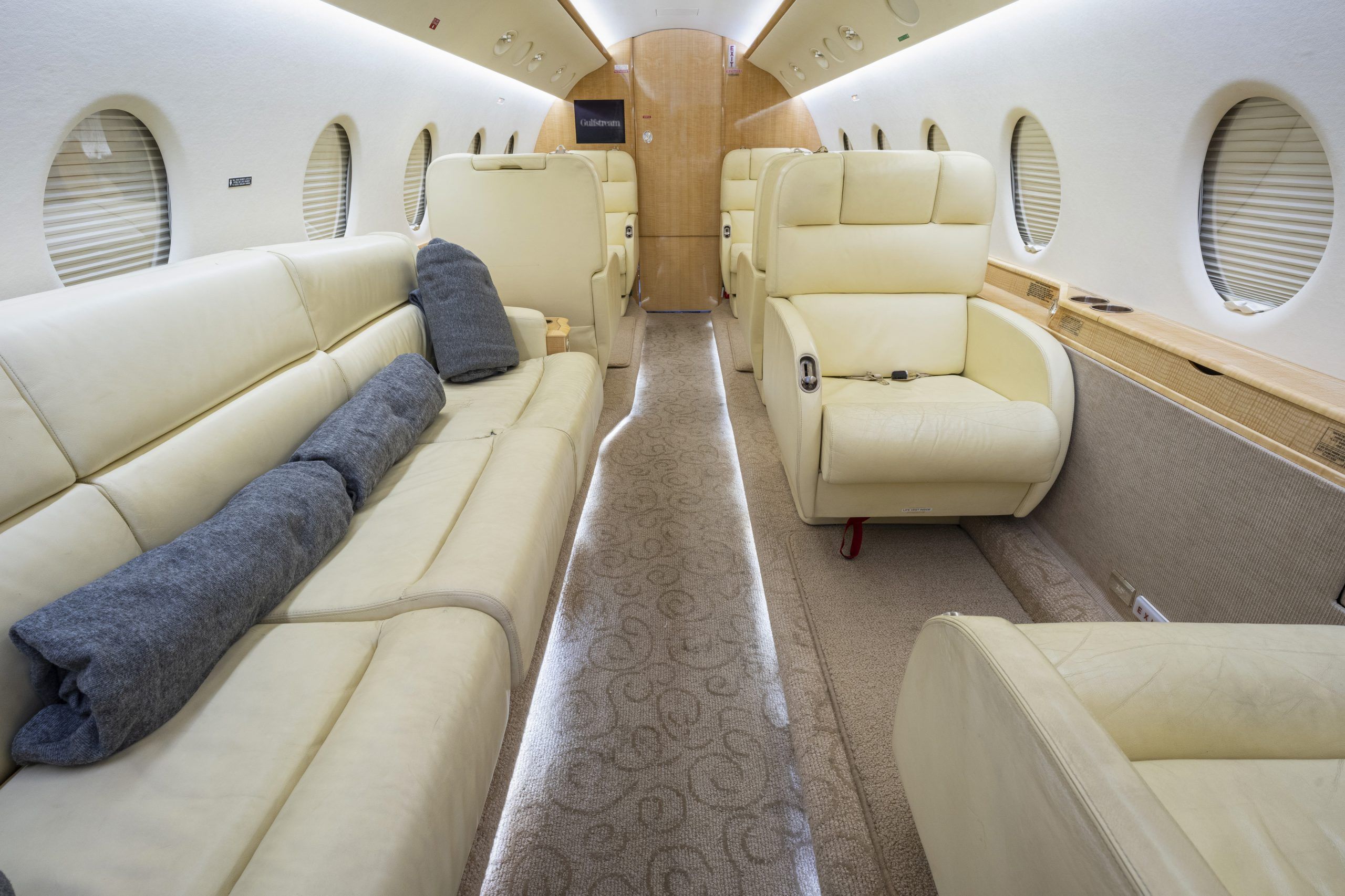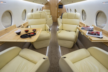 G 200 serial number 179 features a comfortable 9 passenger interior config‐ ured in a forward four place club seating arrangement with pull-out execu‐ tive tables and an aft cabin two place club group opposite a three place ber‐ thable divan that is certified for take off and landing. The seats and divan are finished in French Vanilla colored Erdman leather. The high gloss finish woodwork is perfectly complimented with brushed satin nickel plating. The cabin entertainment and information system includes a multi-disc DVD and moving map - both of which can be displayed on either or both forward and aft bulkhead mounted monitors. The full-width lavatory aft of the passenger cabin is separated by a bulkhead with sliding pocket door and includes a storage closet and custom vanity with wash basin. The forward, full-service galley includes a TIA Microwave Oven, coffee maker, sink, and ample stor‐ age. The in-flight passenger connectivity is provided by the 2-channel Iridium SAT‐ COM system. Additional ameniƟes include LED lighƟng, dual USB ports and 110VAC outlet at each club seat |