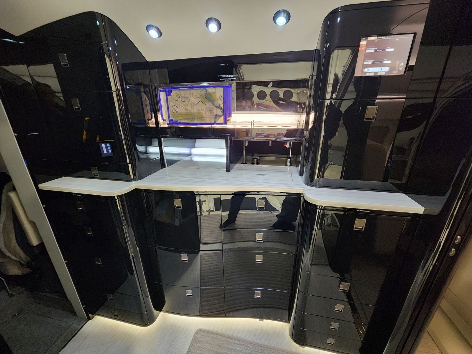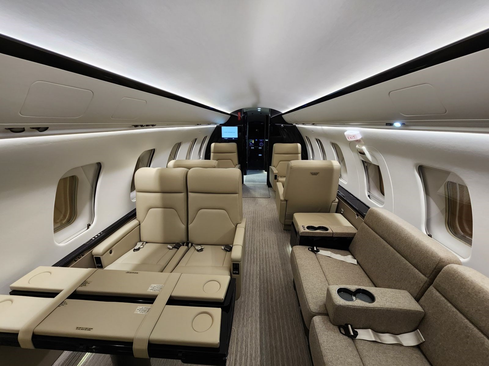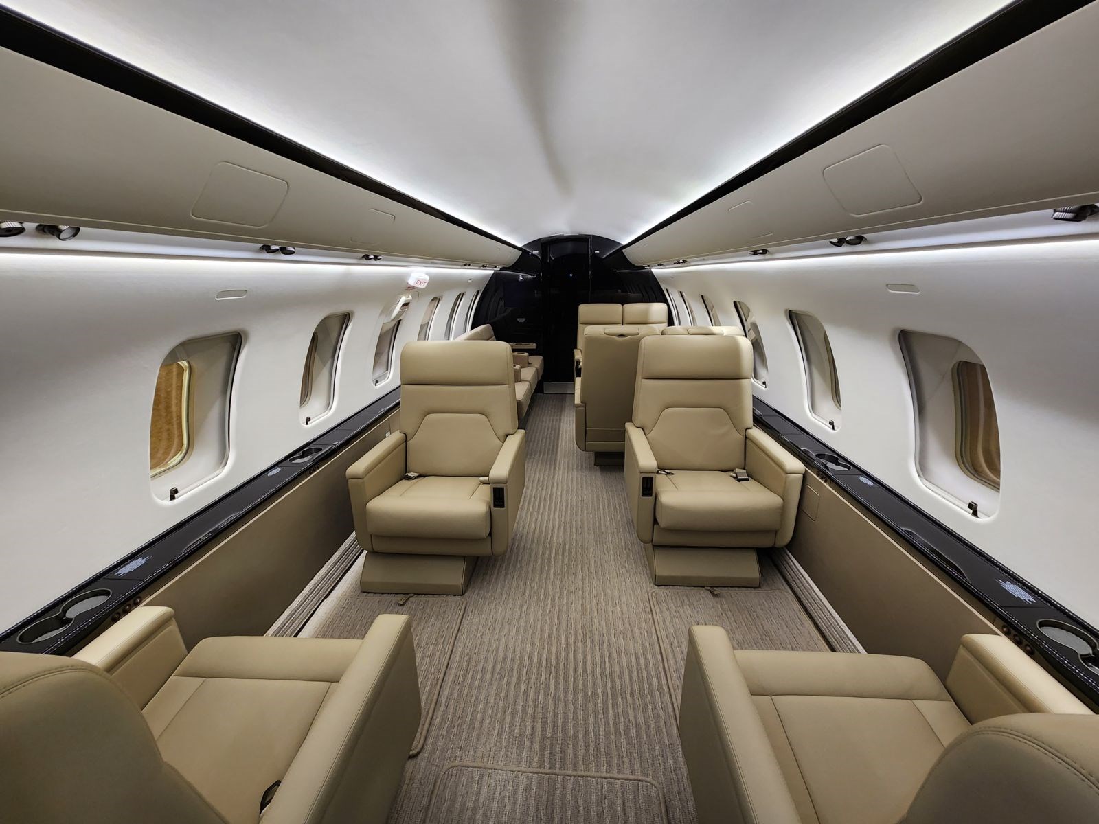 | 12-place configuration New interior June 2023 at BAS Wichita. TCCA, FAA and EASA STC All new softgoods including cabin and crew seat leather, plating, countertops, cabin and cockpit carpet, entry way/galley and lavatory vinyl flooring, sidewalls, dados, headliners, window shades, and curtains Newly refinished hardwood cabinetry throughout the aircraft Twelve (12) place executive interior configuration. Jump seat is for crew use only The forward cabin features four (4) executive seats with two (2) pull out tables The aft LH cabin features a four (4) place conference group with table opposite a four (4) place divan on RH side Location of galley is forward, lavatory is aft, and the baggage compartment is located aft of the lavatory | |