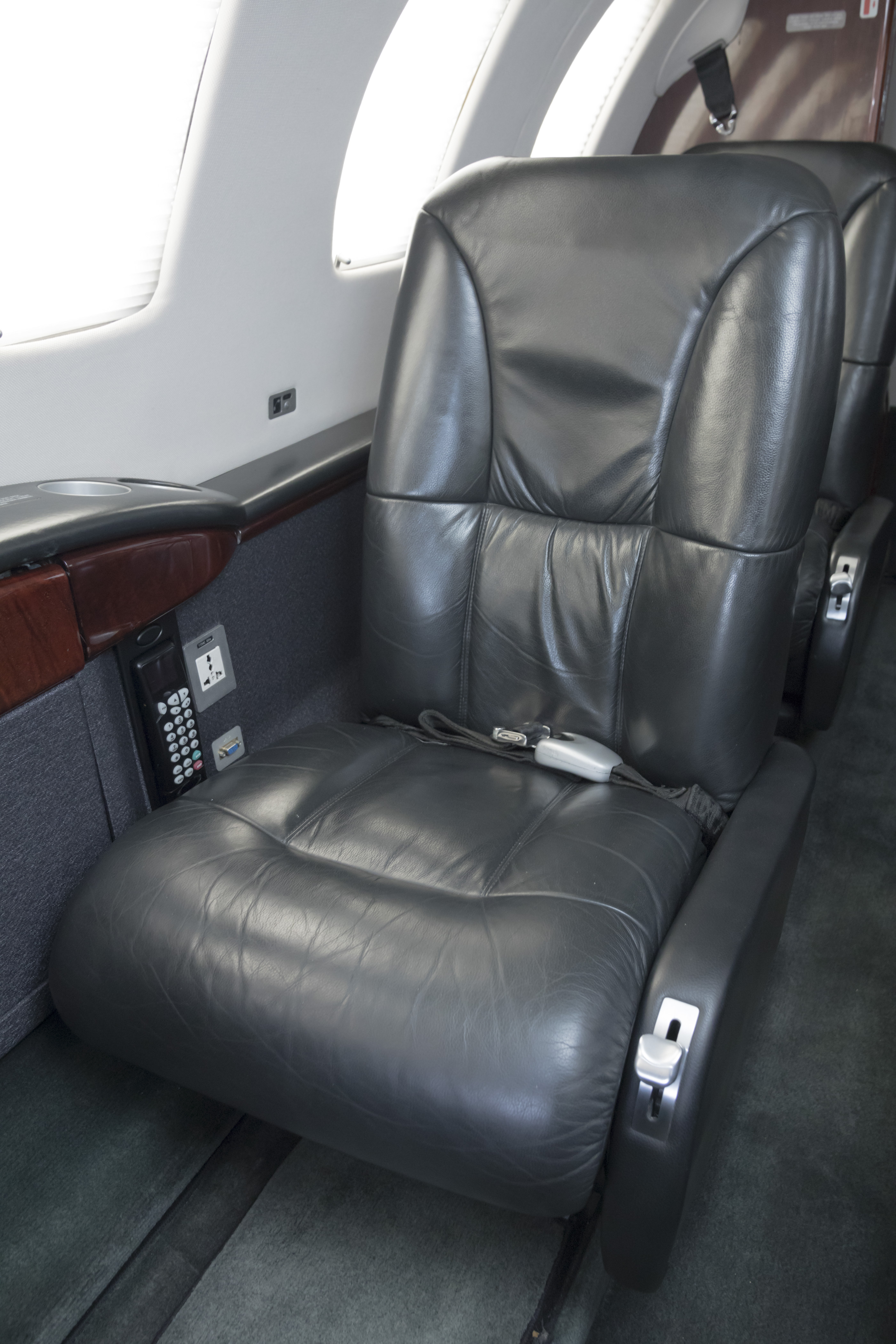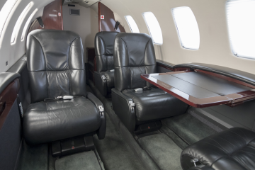 Cabin seating for seven passengers in a center-club arrangement and right hand forward side facing seat. The interior is overall black and gray. Black gloss laminate with brushed aluminum hardware. |