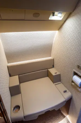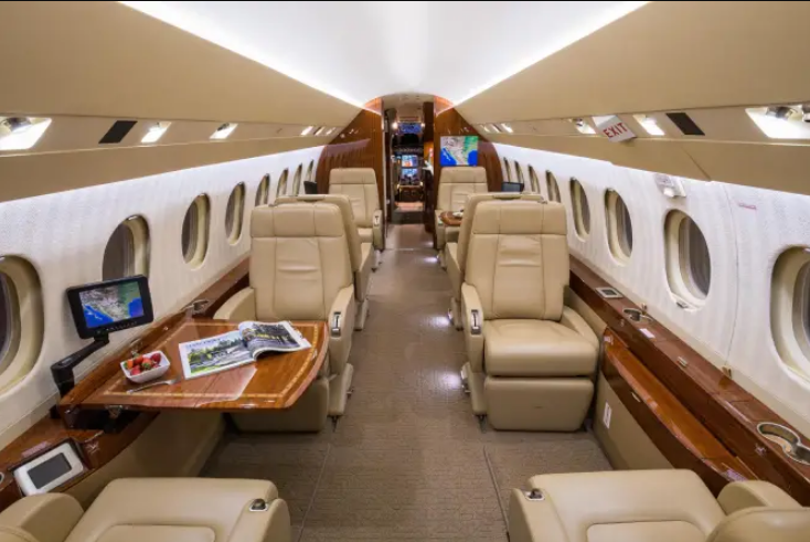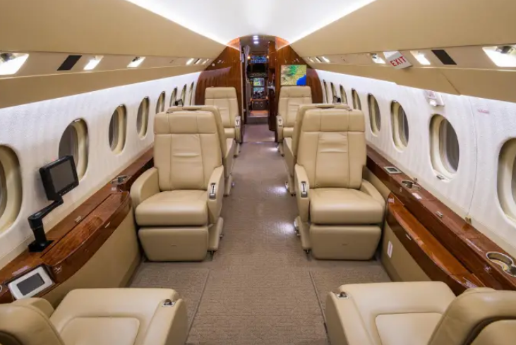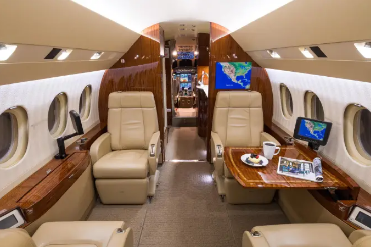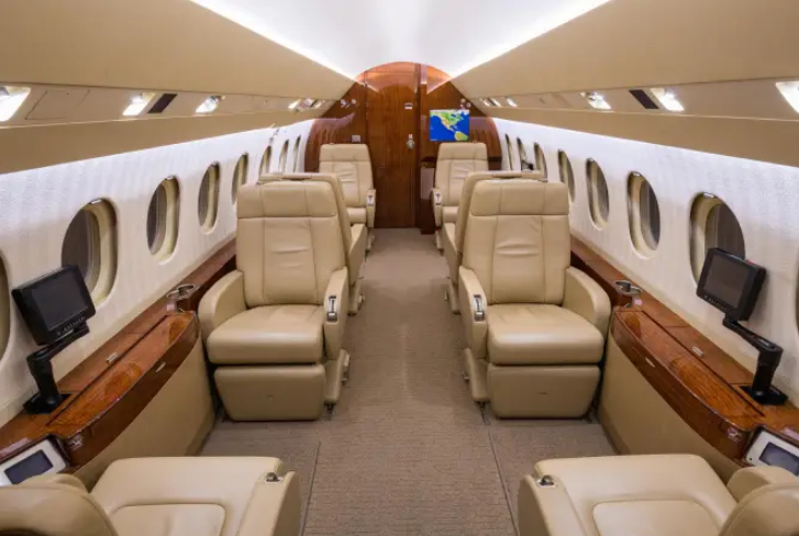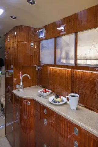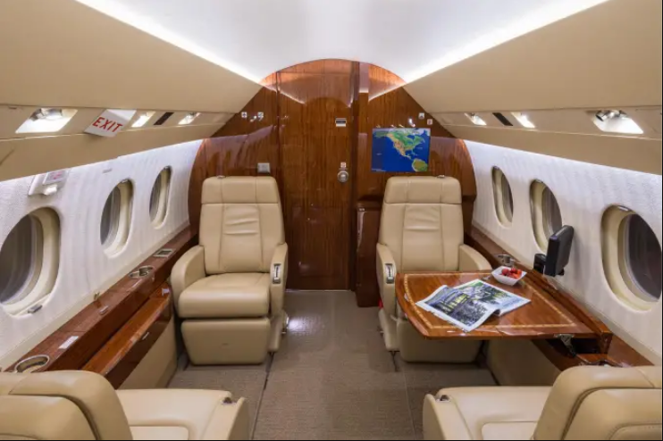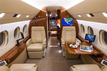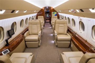 Complete interior refurbishment (November 2017) Eight-passenger seating configuration Reclining leather seats with footrests Warm sand leather, taupe carpet, cream headliner, textured ivory sidewalls High-gloss burl wood veneer with satin nickel accents Third flight deck seat with storage drawer and hangar bar Third crew member oxygen mask LH closet with horizontal manual storage 115VAC 60Hz 2000VA inverter with (7) outlets GoGo Biz® AVANCE L5 Wi-Fi connectivity |