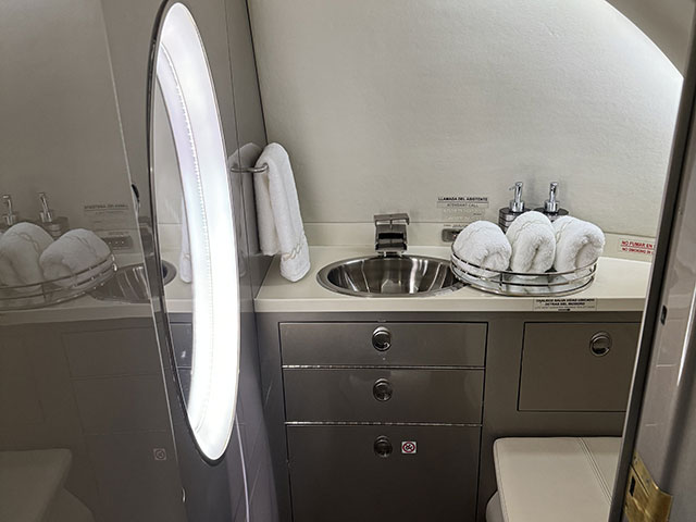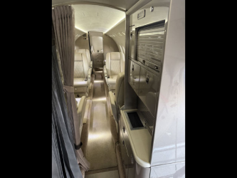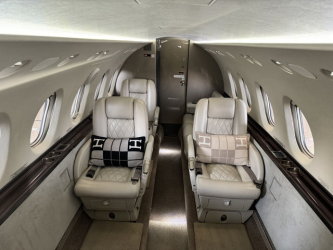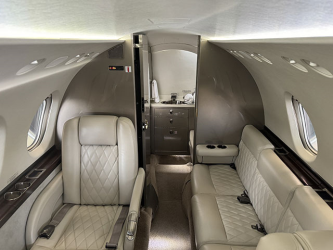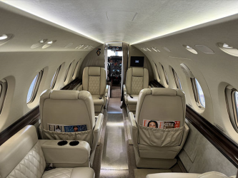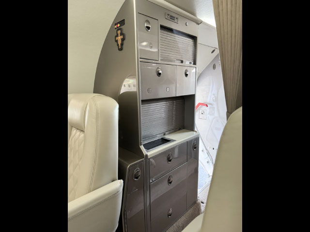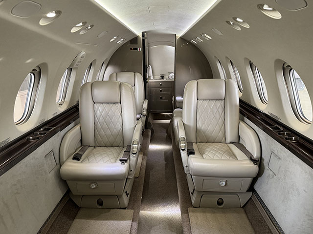 Eight Passenger Interior Consisting of Forward Four-Place Club, Aft Three-Place Divan, Forward Facing Chair and Aft Belted Lav Seat. Dark High-Gloss Wood Finish. Seats Covered in Beige Leather. (New August 2021) |
