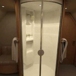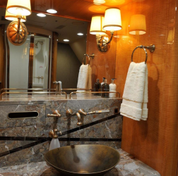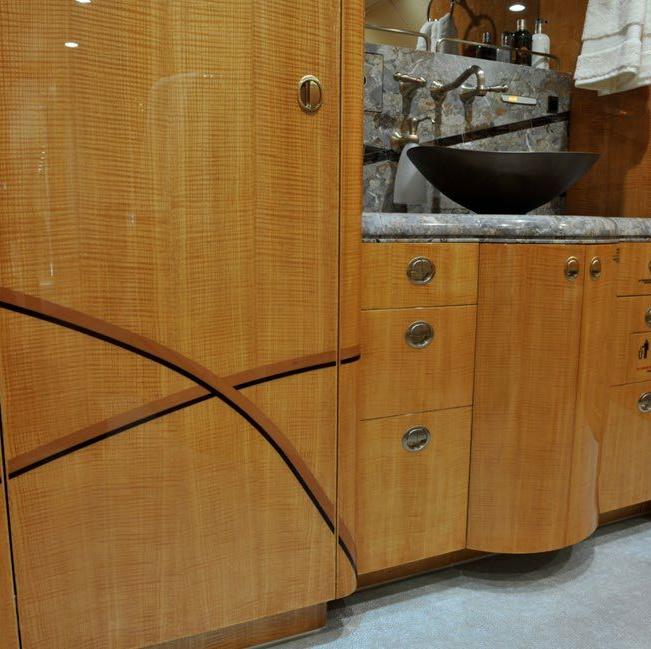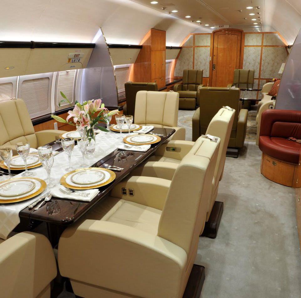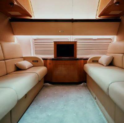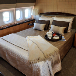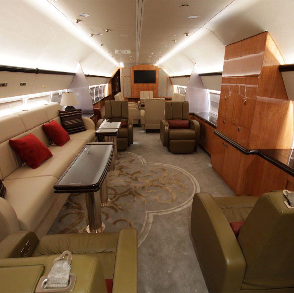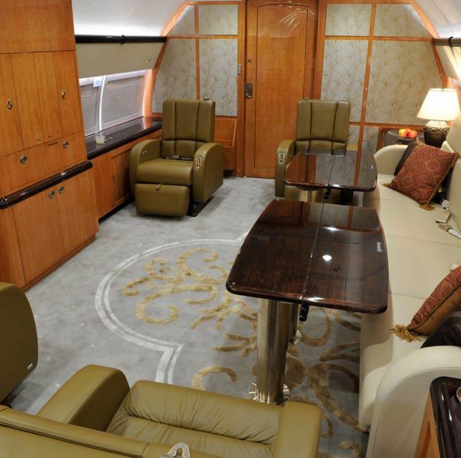 Greenpoint Interior Completion (STC ST01832SE) The cabin is divided into the forward entry, crew lavatory, crew rest, guest lavatory, galley, pantry, lounge, dining/conference, guest bedroom, aft hallway, master bedroom, and master lavatory areas. The forward cabin houses the lounge area, which is laid out with a right side conference/meeting group with a four place divan with two executive chairs and two Hi Lo tables. On the left side of the lounge area is a two place club style seating arrangement with entertainment cabinet The mid cabin area houses a dining group made up of six individual executive style seats with a hi lo meeting/dining table. There is a full length credenza on the right side along with a corner observation/secretary chair. On the aft bulkhead is a 42h flat screen TV/monitor. The hallway, leaving the mid cabin on the right side, leads to a guest room that houses two three place divans that convert into a full size bed. There is a credenza with a 21hM TV/monitor on the left side of the guest room and the room can be made private by the sliding pocket door. The hallway leads further into the master bedroom area. The master bedroom a full size bed and night tables with reading lights, wardrobe and a 42h flat screen TV/monitor on the aft bulkhead. The fully equipped aft lavatory is equipped with vanity, toilet and shower |