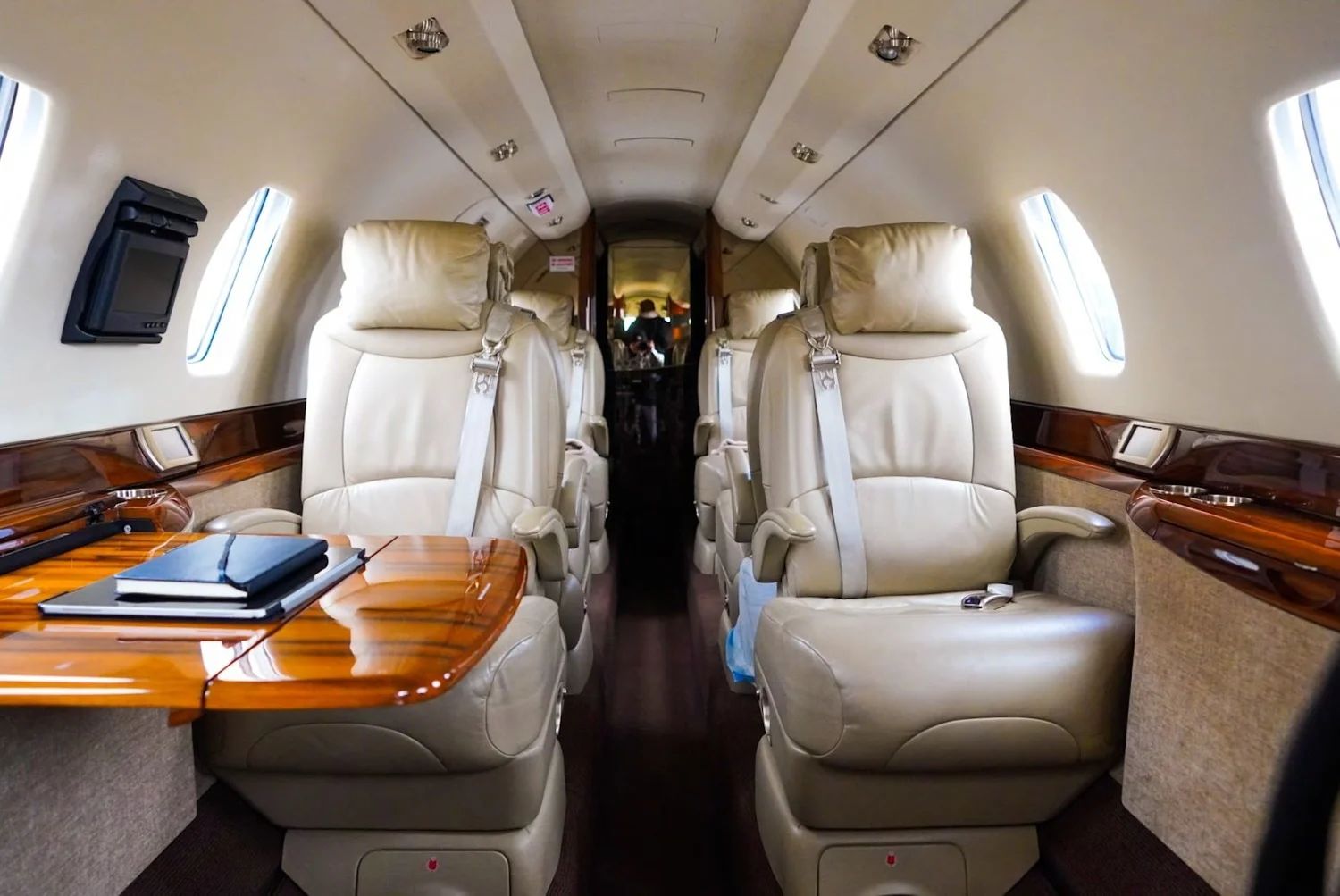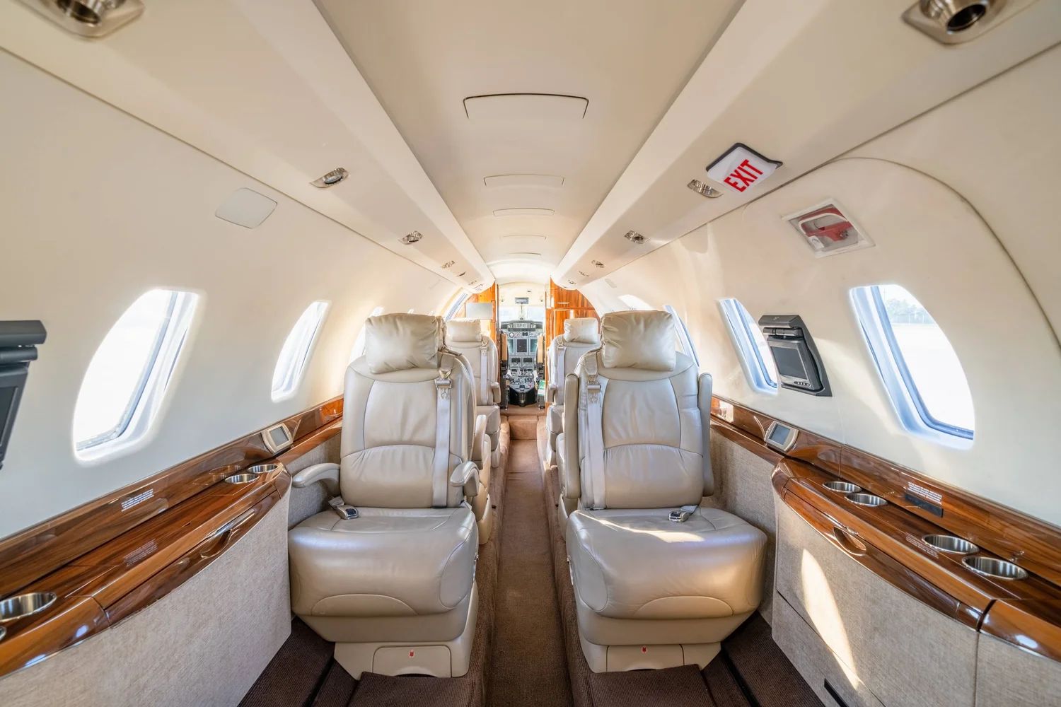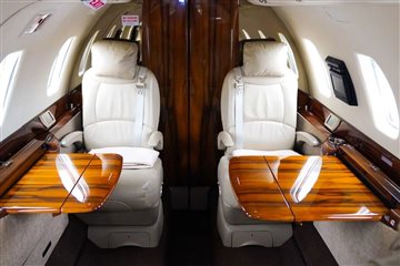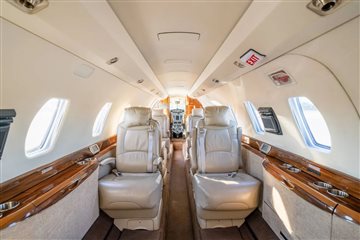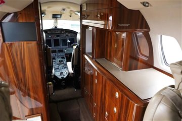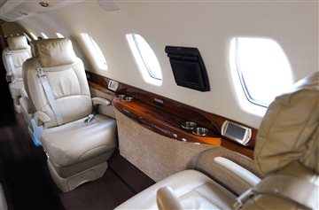 Executive 8 PAX Configuration Cream Leather Double Club Seating Beige Leather Headliner Beige Leather Sidepanels, Cream Fabric Lower Sidepanels Tan Carpeting Forward Galley Belted Aft Lav Forward Storage Closet |