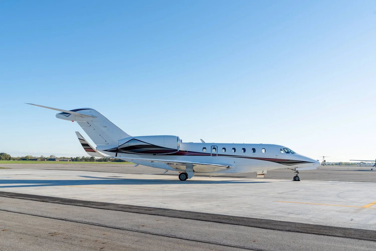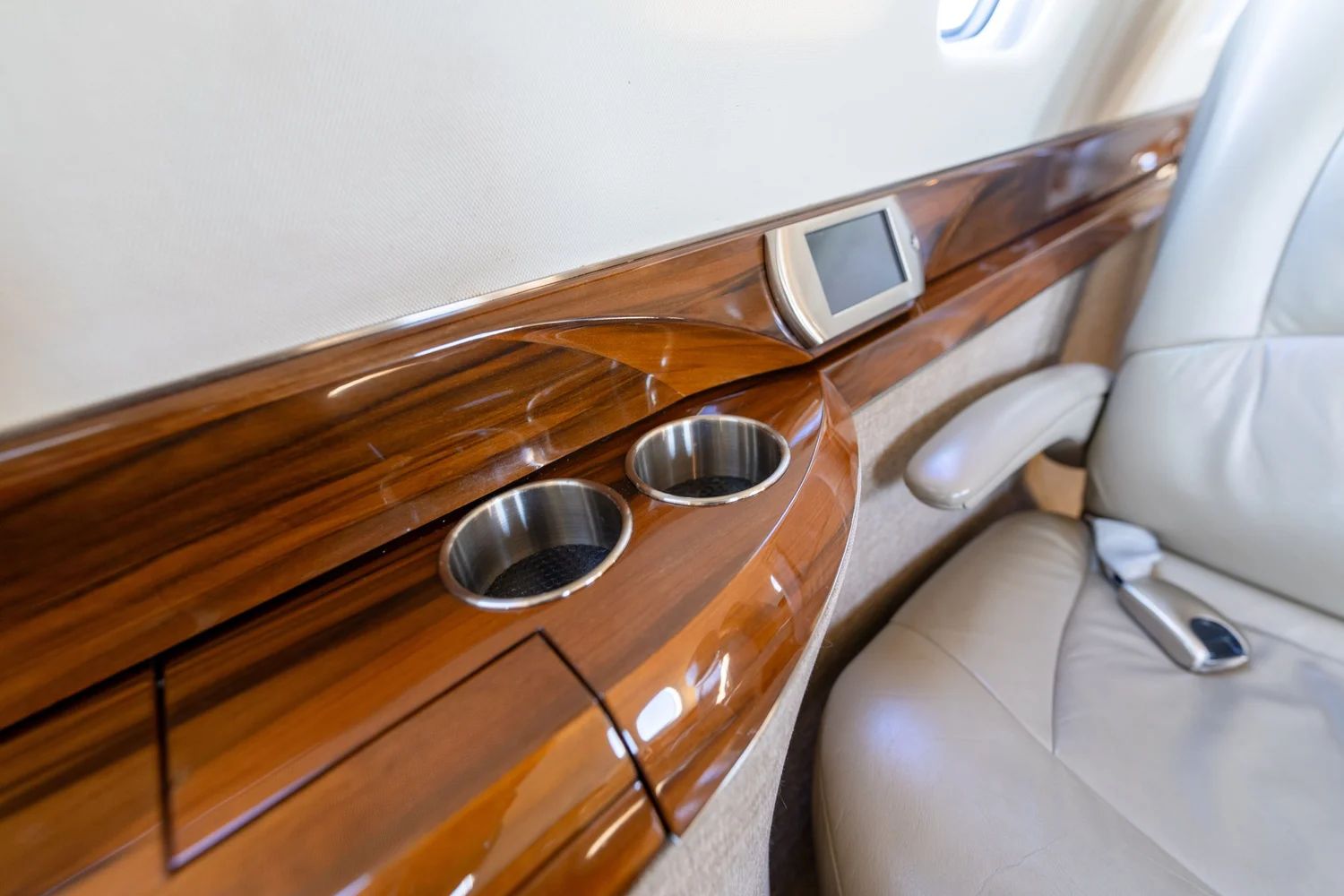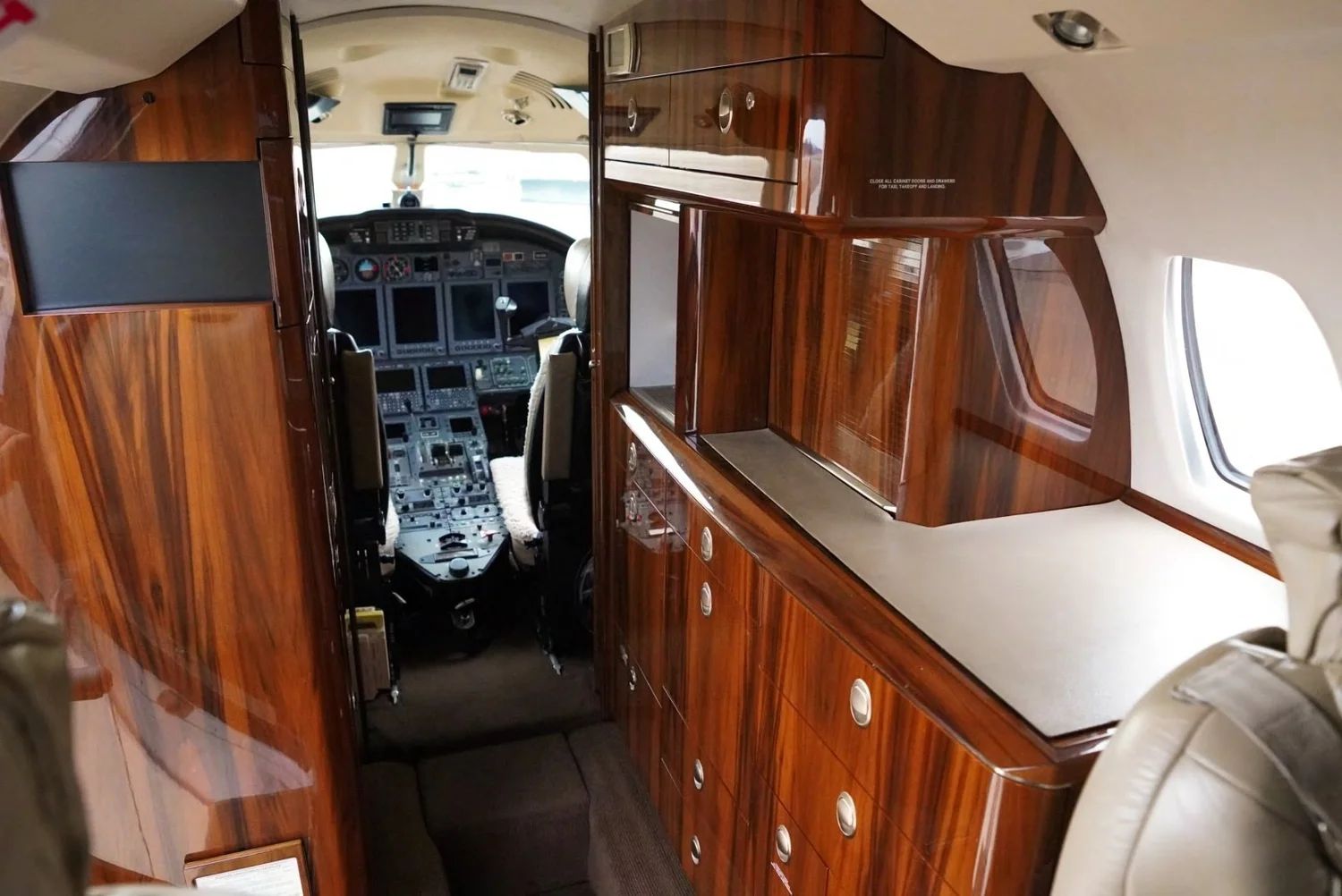 Executive 8 PAX Configuration Cream Leather Double Club Seating Beige Leather Headliner Beige Leather Sidepanels, Cream Fabric Lower Sidepanels Tan Carpeting Forward Galley Belted Aft Lav Forward Storage Closet |