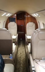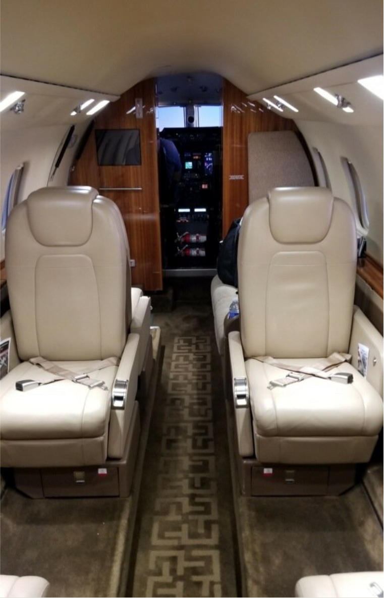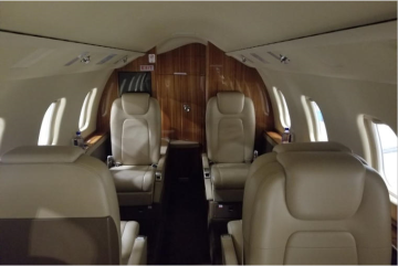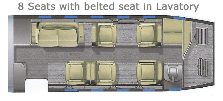 7 pass configuration plus belted lav Beige leather seating / tan carpeting. Five individual seats Two place divan Refreshment : Forward galley High-gloss cabinetry, foldout table Entertainment : Airshow 4000 Dual video monitors, cabin audio system Accessories: Ultraleather PSU Lavatory: Private belted aft lav |