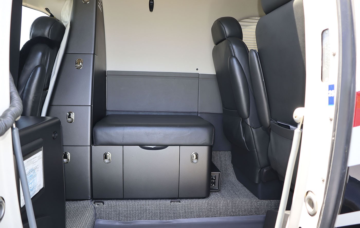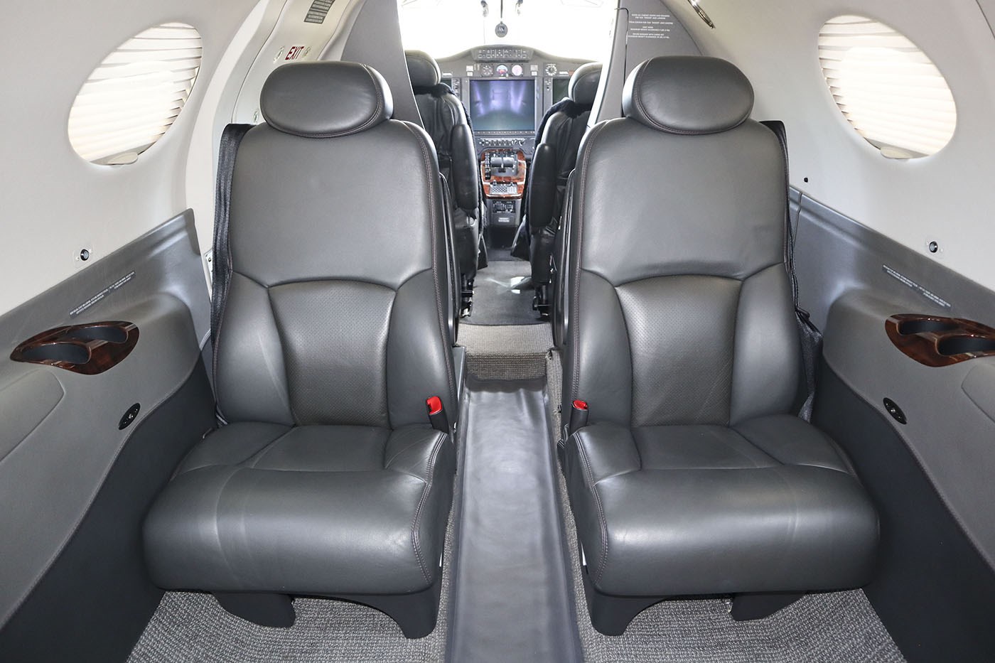 Custom Smoky Quartz Interior Color Scheme with leather topped tables and leather sidewalls. (New 10/31/2019). Cabin Cabin seating for 4 passengers Left-hand and right-hand forward storage cabinets Dual executive tables Aft center console Forward side-facing non-belted toilet |