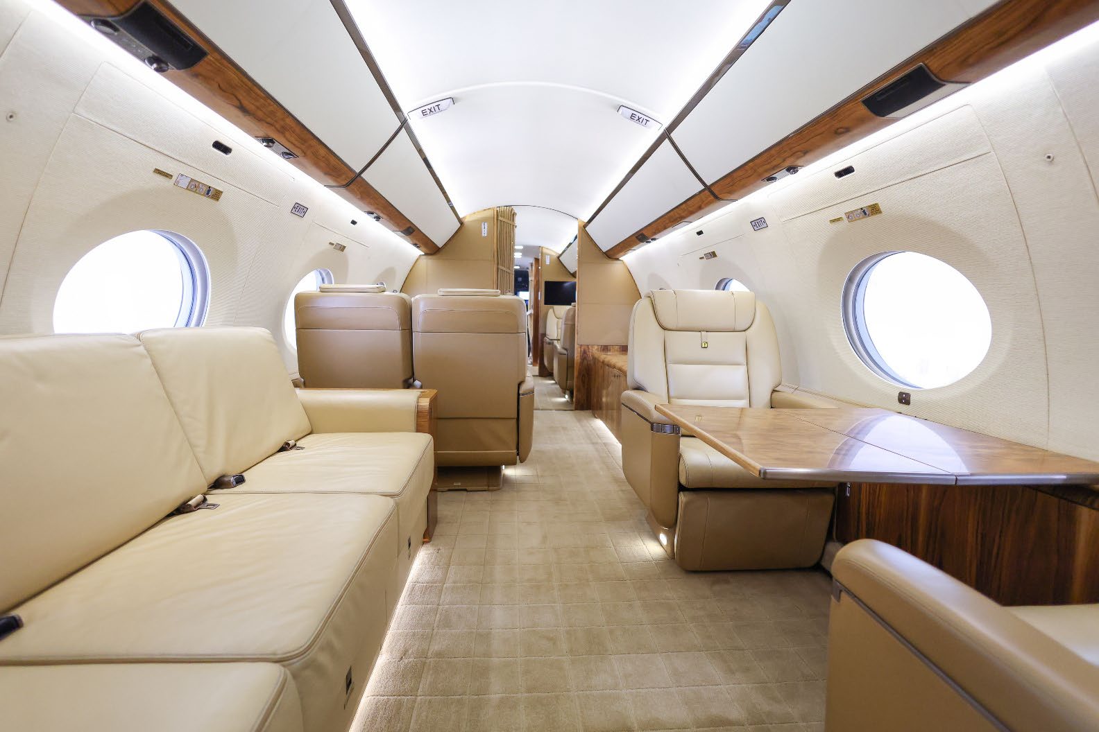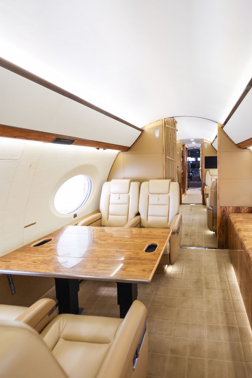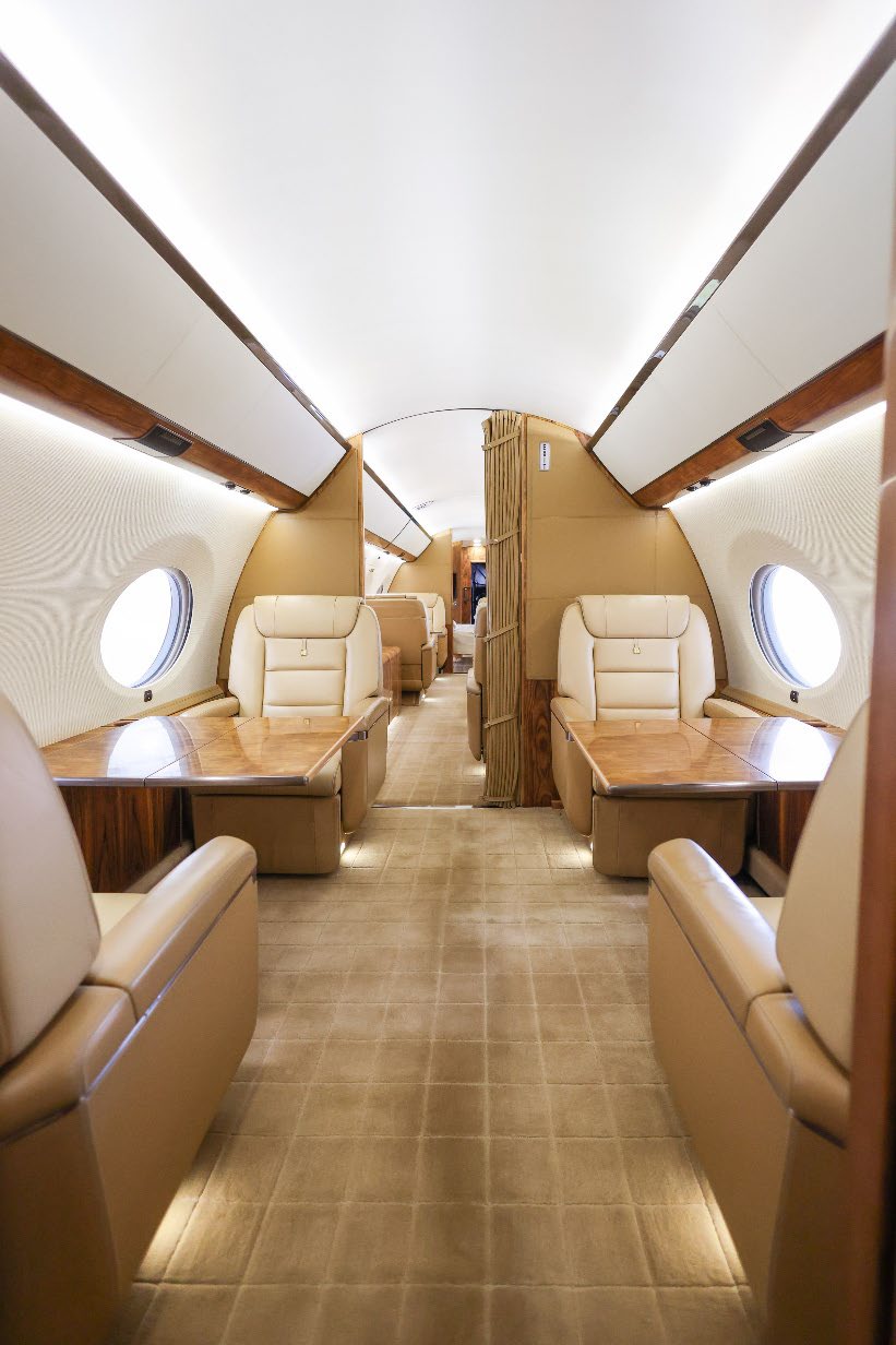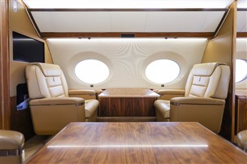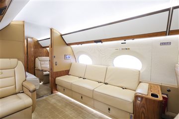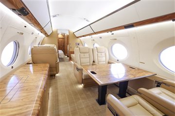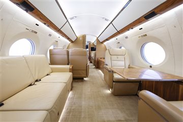 NUMBER OF PASSENGERS - Fiveteen (15) FWD VESTIBULE - Four (4) Place Captain Chairs. Curtain Between 1st And 2nd Section. FWD CABIN CONFIGURATION - Four (4) Place Conference Group Left With Credenza Right. Popup Monitor. MID CABIN CONFIGURATION - Two (2) Single Seats Left Across From Divan Right. Pocket Door Between 3rd And 4th Section AFT CABIN CONFIGURATION - Right Hand Side Divan With Single Seat, Foldout Table And Dual Bulkhead Mounted Monitors, Floor To Ceiling Storage Closet Behind Single Seat GALLEY - Fully equipped two-sided Galley GALLEY EQUIPMENT - Stainless Steel Trimmed Appliance Stack Comprised of: Two Coffee Makers, Microwave Oven, Pull-out Work Surface, Convection Oven, Refrigerator With Upper Freezer Section, Two Separate Ice Drawers, One Large Drink Storage Drawer With Secondary Soda Can Drawer, Sink With Hot / Cold Water Faucet, Soild Surface Counter Tops With Sink Cover, Lighted Overhead Storage On Both Sides For Crystal, Flat Ware And China Storage Inserts On Left Side Drawers Below Sink, Large Storage Areas For Supplies, Food, Beverages And Waste, Water Sterilization System, Color Touch-screen Control Panel (GCMS-2), Motorized Pocket Door Separating Galley From Cabin Area. LAV - Fwd. & Aft: Vacuum toilets, Sinks with hot / cold water faucet controlled by pressure mats, Solid surface countertops, Mirror, vanity and indirect lighting, Upper medicine cabinet with mirror in Aft lavatory Dedicated Sleep Mode Designed And Installed By Gulfstream: EXTRAS 1. Turns Off All Lighting In Cabin Section 2. Includes Turning Off All PSU, Window Lighted Switches And Monitors 3. Turns Off Aft Lav Lighting 4. Provides A Truly Full Dark Sleeping Area |