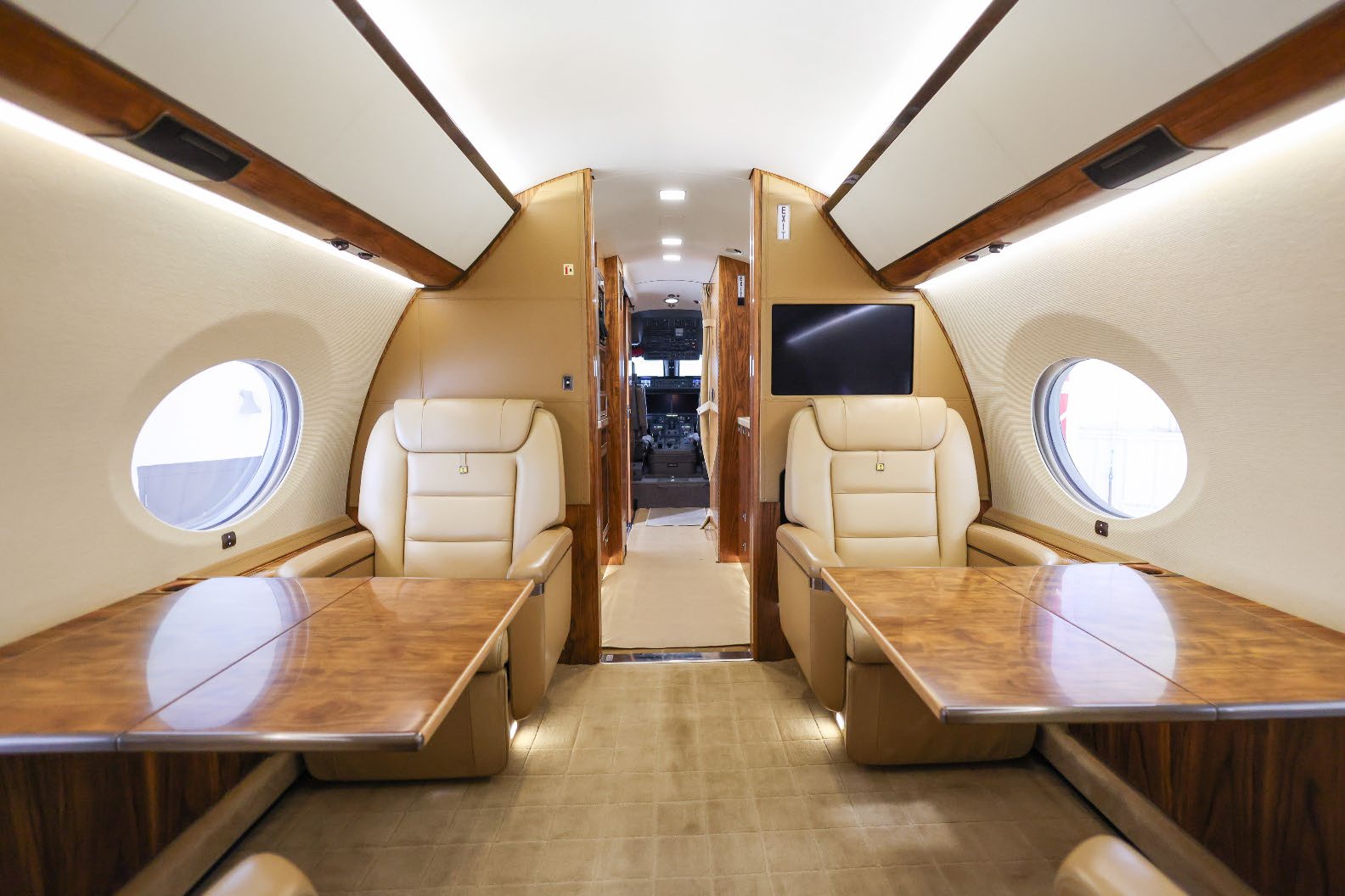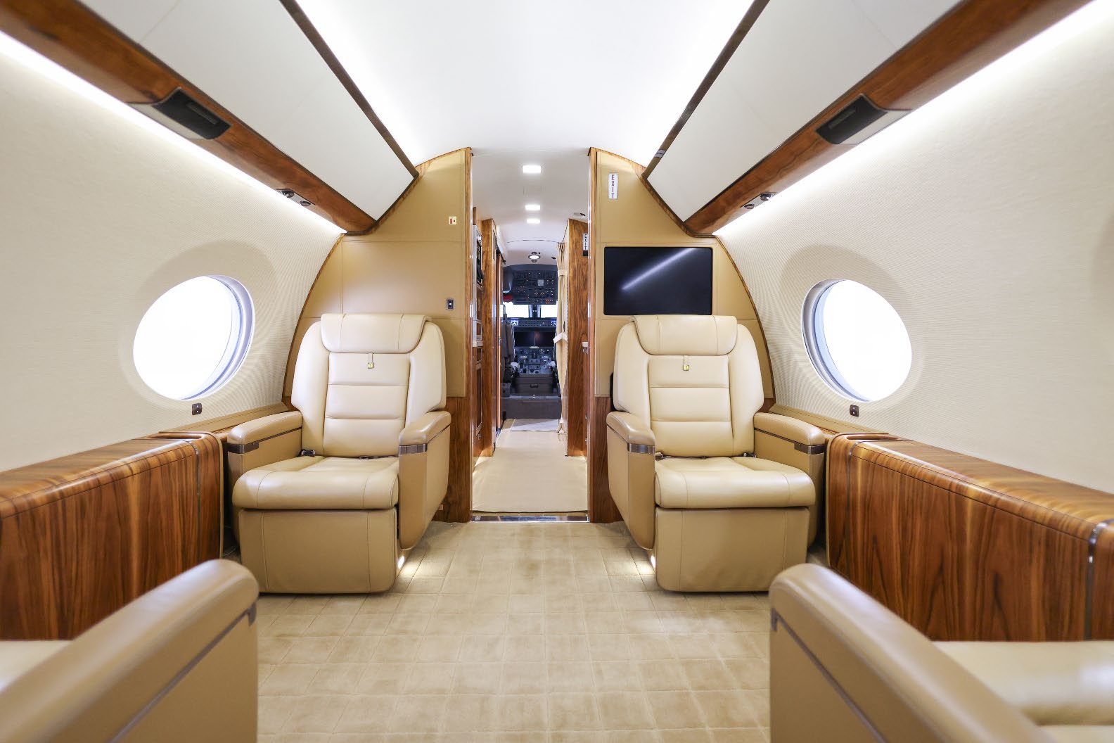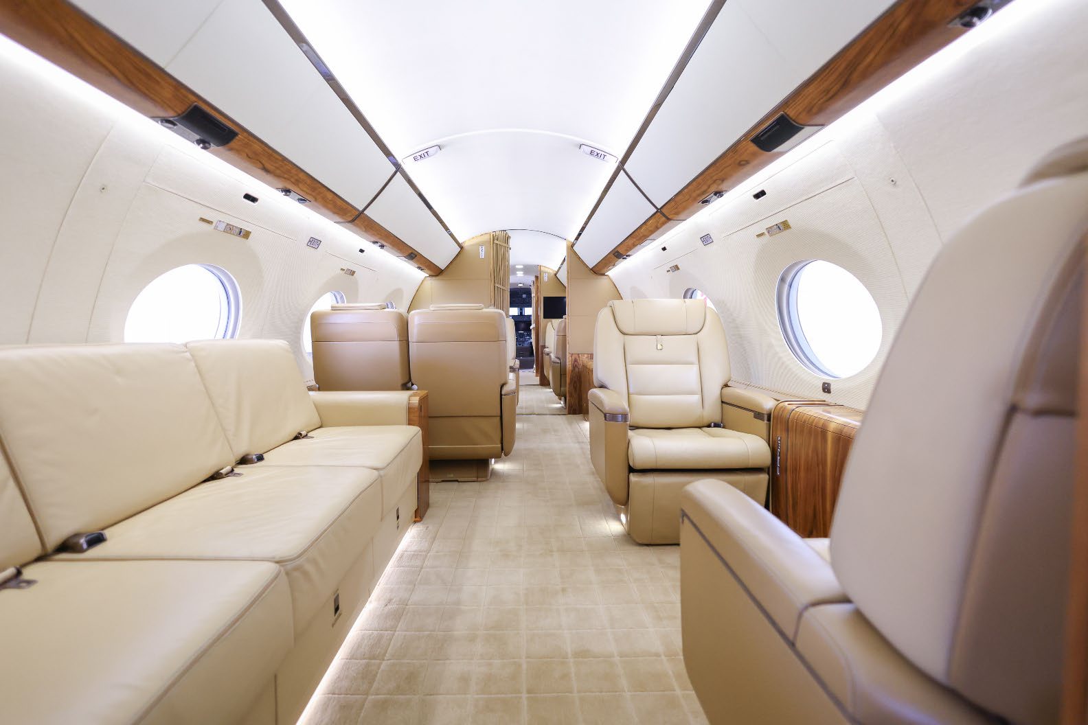 NUMBER OF PASSENGERS - Fiveteen (15) FWD VESTIBULE - Four (4) Place Captain Chairs. Curtain Between 1st And 2nd Section. FWD CABIN CONFIGURATION - Four (4) Place Conference Group Left With Credenza Right. Popup Monitor. MID CABIN CONFIGURATION - Two (2) Single Seats Left Across From Divan Right. Pocket Door Between 3rd And 4th Section AFT CABIN CONFIGURATION - Right Hand Side Divan With Single Seat, Foldout Table And Dual Bulkhead Mounted Monitors, Floor To Ceiling Storage Closet Behind Single Seat GALLEY - Fully equipped two-sided Galley GALLEY EQUIPMENT - Stainless Steel Trimmed Appliance Stack Comprised of: Two Coffee Makers, Microwave Oven, Pull-out Work Surface, Convection Oven, Refrigerator With Upper Freezer Section, Two Separate Ice Drawers, One Large Drink Storage Drawer With Secondary Soda Can Drawer, Sink With Hot / Cold Water Faucet, Soild Surface Counter Tops With Sink Cover, Lighted Overhead Storage On Both Sides For Crystal, Flat Ware And China Storage Inserts On Left Side Drawers Below Sink, Large Storage Areas For Supplies, Food, Beverages And Waste, Water Sterilization System, Color Touch-screen Control Panel (GCMS-2), Motorized Pocket Door Separating Galley From Cabin Area. LAV - Fwd. & Aft: Vacuum toilets, Sinks with hot / cold water faucet controlled by pressure mats, Solid surface countertops, Mirror, vanity and indirect lighting, Upper medicine cabinet with mirror in Aft lavatory Dedicated Sleep Mode Designed And Installed By Gulfstream: EXTRAS 1. Turns Off All Lighting In Cabin Section 2. Includes Turning Off All PSU, Window Lighted Switches And Monitors 3. Turns Off Aft Lav Lighting 4. Provides A Truly Full Dark Sleeping Area |