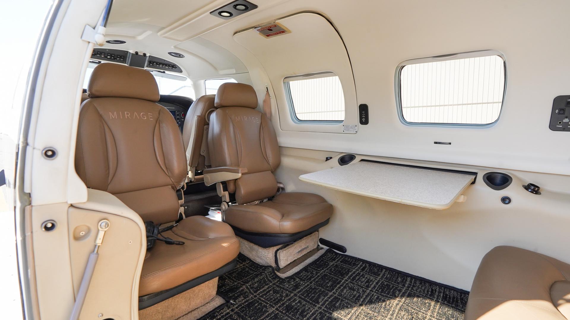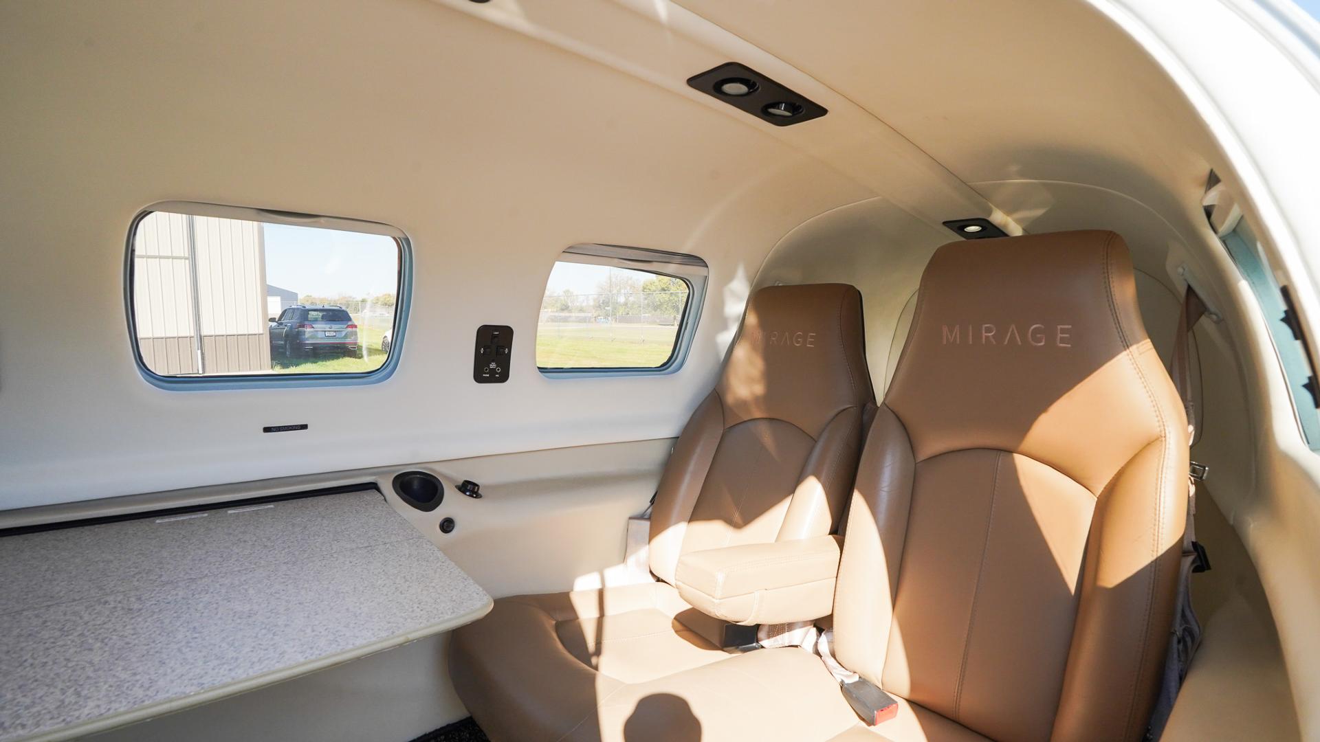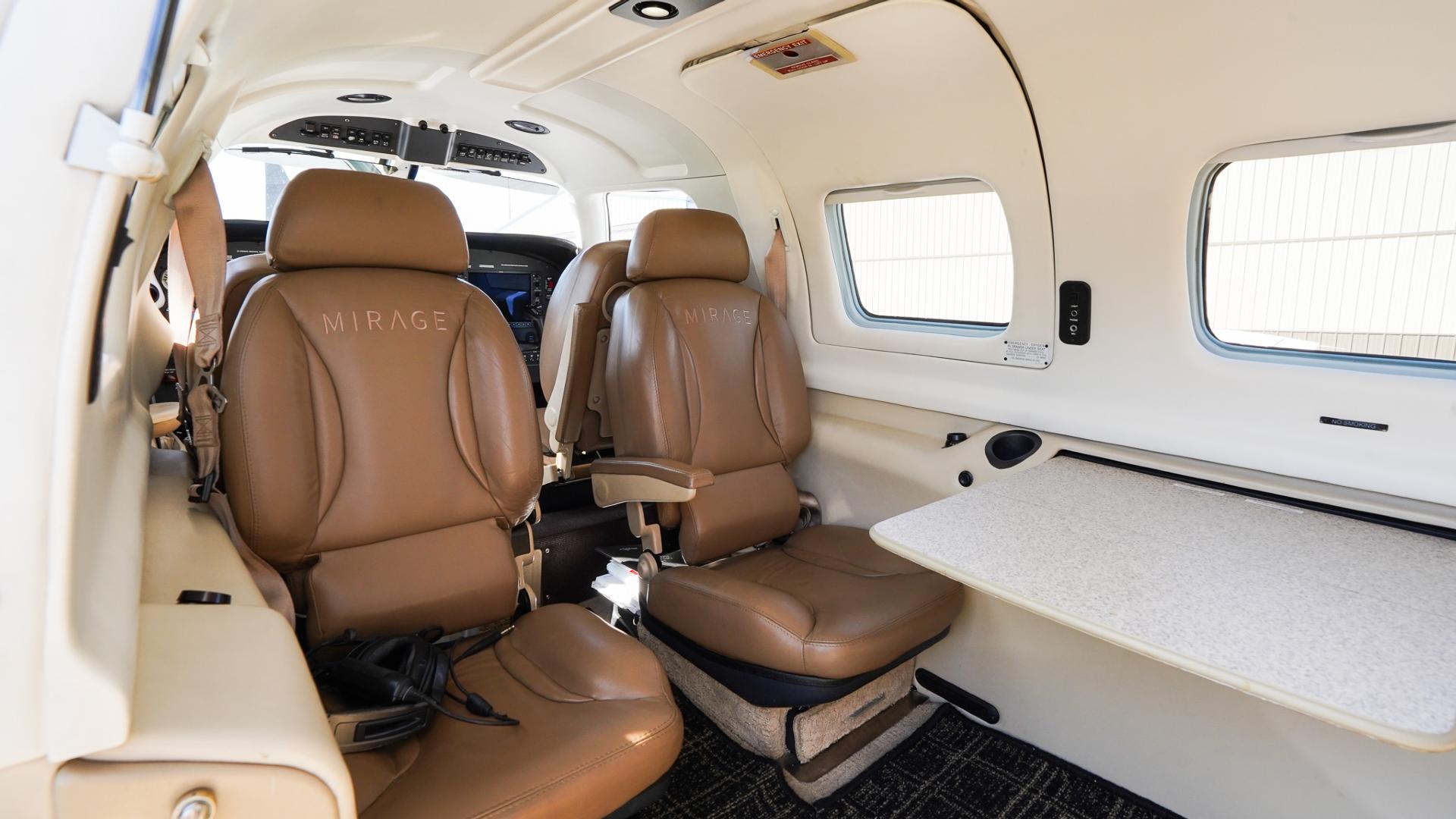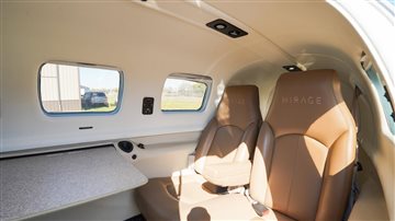 | Step inside to a warm and stylish tan leather interior, accented with matching tray tables and a tasteful black-and-tan flooring combination. The cabin is clean, well-kept, and in good overall condition, offering both comfort and sophistication. With club seating for passengers, you’ll enjoy plenty of space to stretch out, work, or relax during your flights. The thoughtful layout and finishes make this Mirage as enjoyable inside as it is impressive outside. Ride in style, with comfort and room to spare—ready to go wherever your journey takes you. | |