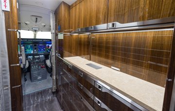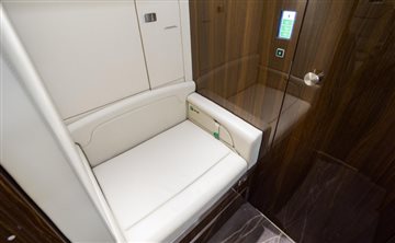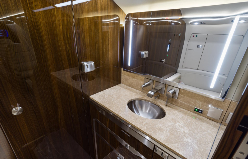 At the rear, the aircraft features a private aft lavatory with a belted seat.