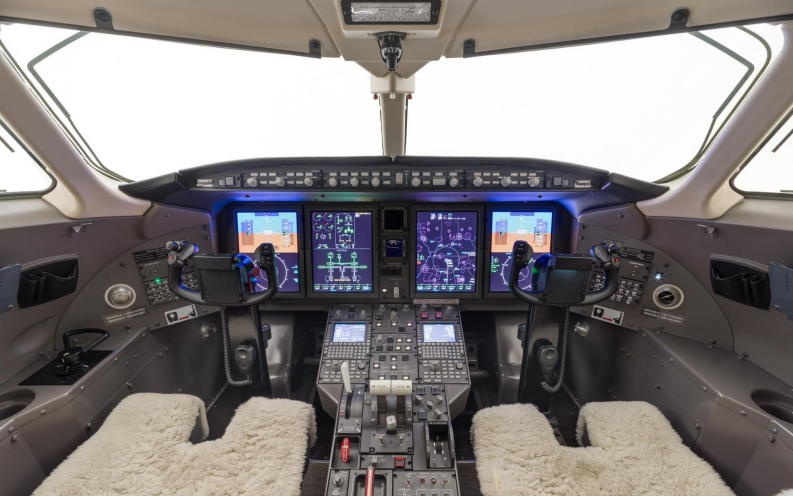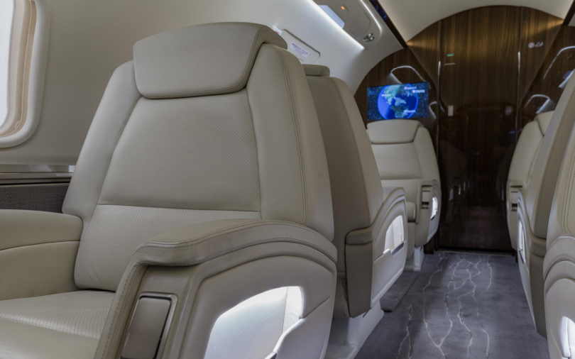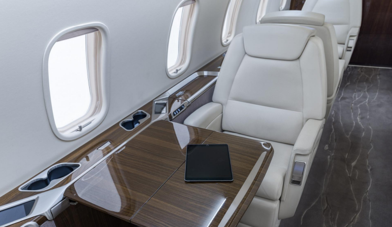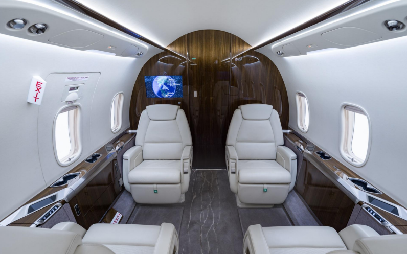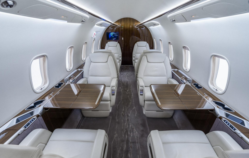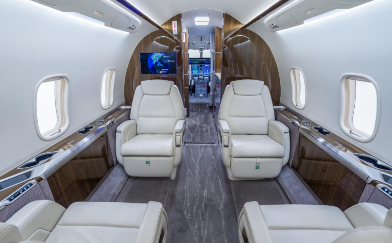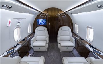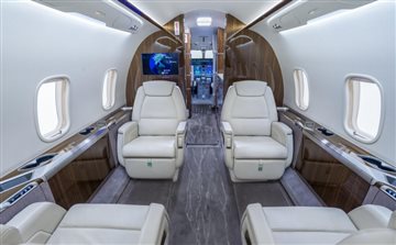 The cabin is arranged in a forward double-club configuration, followed by an aft double-club and a fully belted aft lavatory seat. Light beige leather seating, high-gloss walnut wood accents, and a gray patterned carpet elevate the interior, while clean lines and optimized lighting create a quiet, inviting environment throughout the flight.