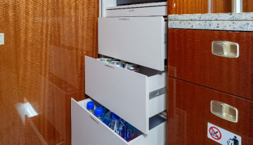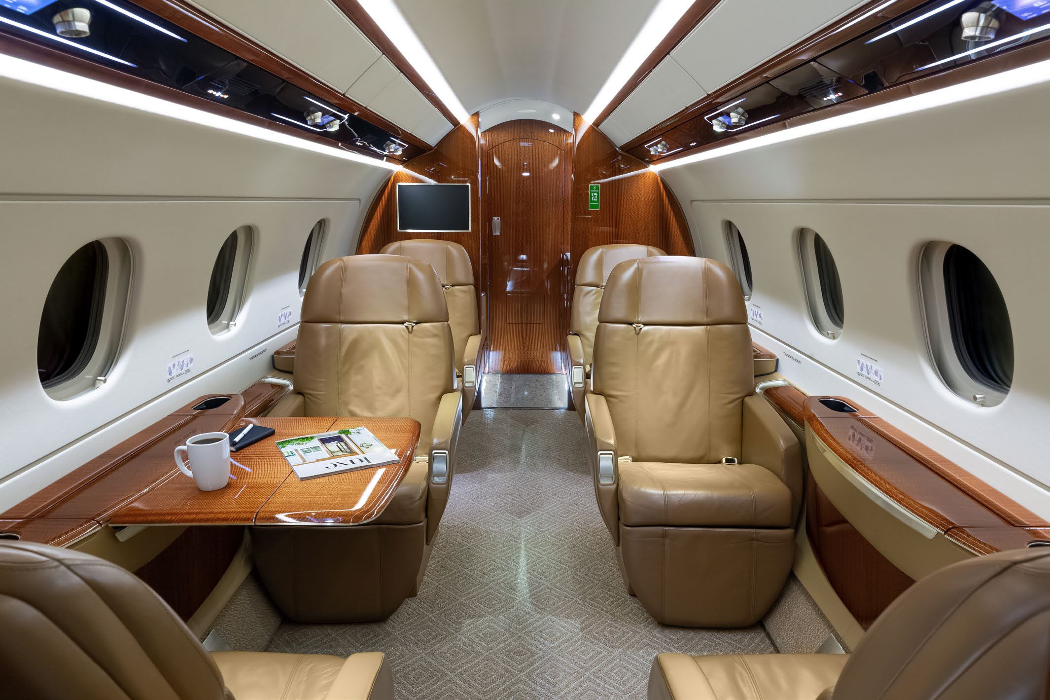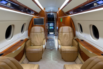 (Original) 6-passenger cabin configuration features an additional 2 certified seats, which includes a jump seat and a belted lavatory. Forward Galley: This Praetor 500 boasts a fully equipped forward galley, offering enhanced storage capacity. The full forward galley includes stone flooring and countertops, a forward-facing jump seat, a microwave oven, a coffee brewer, a thermo-acoustic curtain for the main door, and features the high power outlet option. The forward-facing jump seat conveniently retracts into the closet and is equipped with a full audio panel. The high power outlet option converts 28VDC to 115VAC/60Hz, providing two additional output ports with a combined power of 1200 VA. There is one port in the galley and one in the lav. The galley sink is fully operational with hot and cold water, offering a 15-liter capacity that can be drained effortlessly with a single push of a button from the cockpit. Main Cabin: Adjacent to the forward galley is a pocket door that separates the galley from the main cabin. The mid cabin offers a four-place club seating arrangement with foldable tables and power outlets next to each seat (low power outlet option). Following the four-place club, the aft cabin features two forward-facing executive seats with foldable tables and power outlets. Aft Lavatory: The aft lavatory, separated by a pocket door, includes a belted lavatory, stone flooring, and stone countertops. The vacuum lavatory system has an 18-liter water capacity. Like the galley, the lavatory sink is fully operational with hot and cold water and can be easily drained with a single push of a button from the cockpit. |