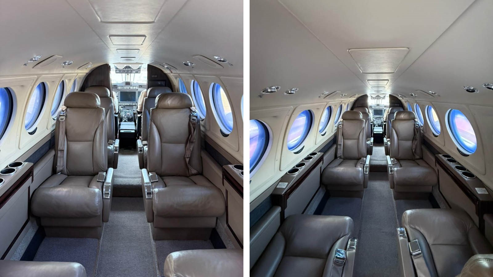 Color Scheme: Mocha Package Headliner: Khaki Waypoint vinyl Sidewall Inset Panel: Mink leather Sidewall Rail: Charcoal Tatami fabric Sidewall Armrest: Mink leather Cabin & Cockpit Sidewalls: Mink leather Aft Curtain: Charcoal Tatami fabric Floor Covering: Cork Flight carpet Laminate: Tendu/Premier Ebony Chairs: Mink leather Seatbelts / Harness: Pampas Instrument Panel: Nextel-Suede: Dark Anthracite |