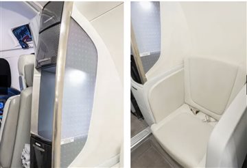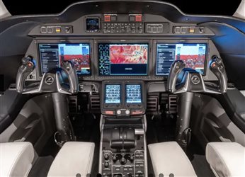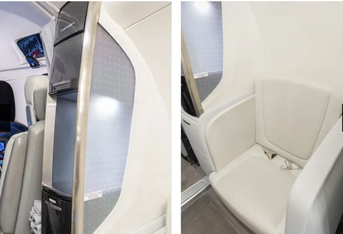 Five (6) Passenger Interior featuring a Forward Side Facing Seat Followed by Four (4) Executive Chairs All Completed in Cool Grey Leather. The Interior is Accented with Dark Grey Accent Colors, Brushed Ice Silver, and Eucalyptus Trim