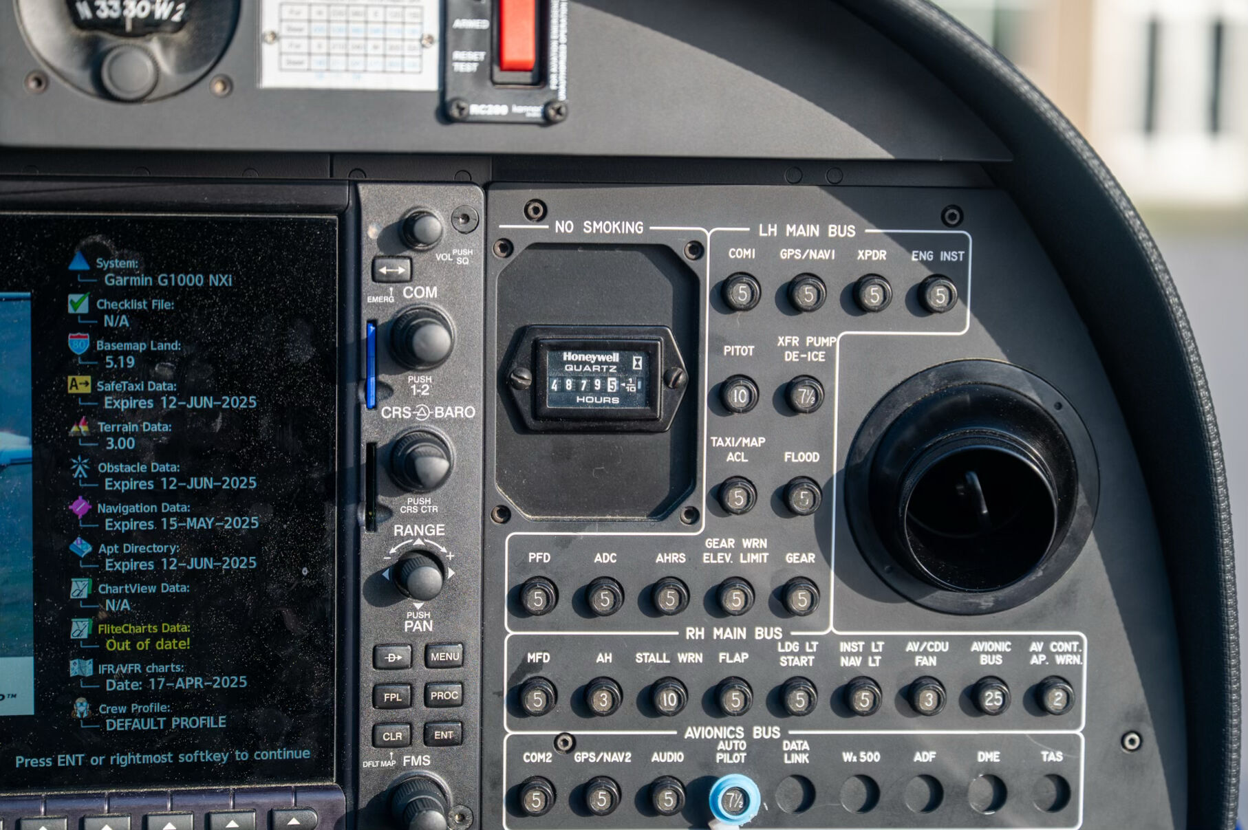 2x Garmin GDU 105x 10-Inch Flight Display (PFD and MFD) Garmin GEA 71B Airframe/Engine Interface Unit 2x Garmin GIA 64 W COM/NAV/SBAS-GPS/GS/LOC Garmin GMA 1360 Digital Audio System Garmin GRS 79 Attitude Heading Reference System Garmin GDC 72 Digital Air Data Computer Garmin GMU 44 Magnetometer Garmin FliteCharts Approach Plates (Subscription required) Garmin Flight Stream 510 ELT 406 MHz Garmin GFC 700 Automatic Flight Control System Garmin GTX 335R ADS-B Out Transponder Standby instruments: compass, attitude indicator, airspeed indicator, altimeter |