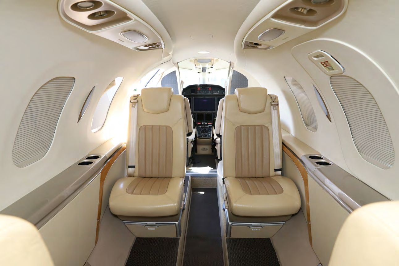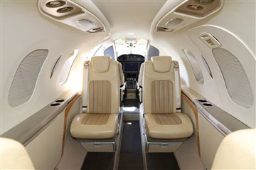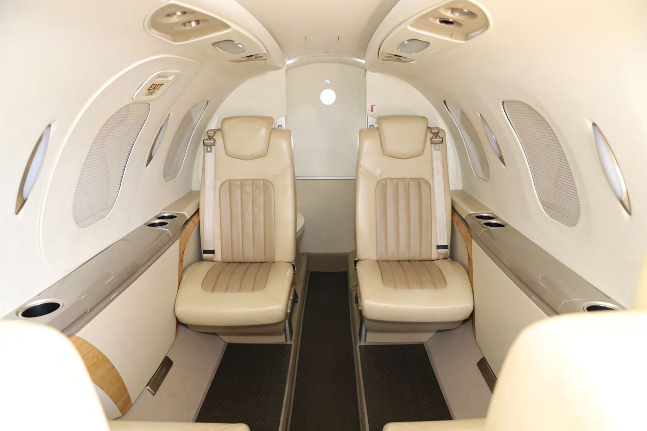 The interior is configured in a 6-passenger layout with a club plus a belted side facing seat. Additionally, the aircraft features a private fully enclosed aft lavatory that is certified for occupancy during takeoff and landing. The interior color palette is a warm color. Luxury two-toned warm leather. Tray Tables, Storage, and interior trim accents. This palette is consistent in the cockpit and lavatory environments. |